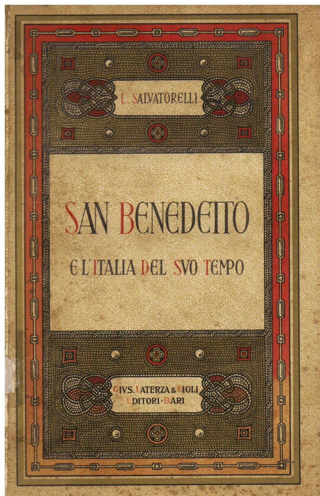 In-8°, pp. 200, cartonatura marmorizzata con titolo calligrafato su tassello cartaceo al dorso. Conservata la brossura editoriale, decorata a più colori. Leggere ingialliture marginali e minimi consolidamenti degli angoli superiori esterni delle ultime pp. Buon esemplare. Prima edizione di questa referenziale monografia su San Benedetto e la regola benedettina, uno dei libri più famosi di uno dei massimi storici del '900 italiano: Teodorico a Roma, Italia religiosa, Benedetto eremita, Benedetto abate, L'Esodo, Montecassino, La regola: le istituzioni e lo spirito, Gli ultimi anni, San Benedetto nella storia d'Italia.