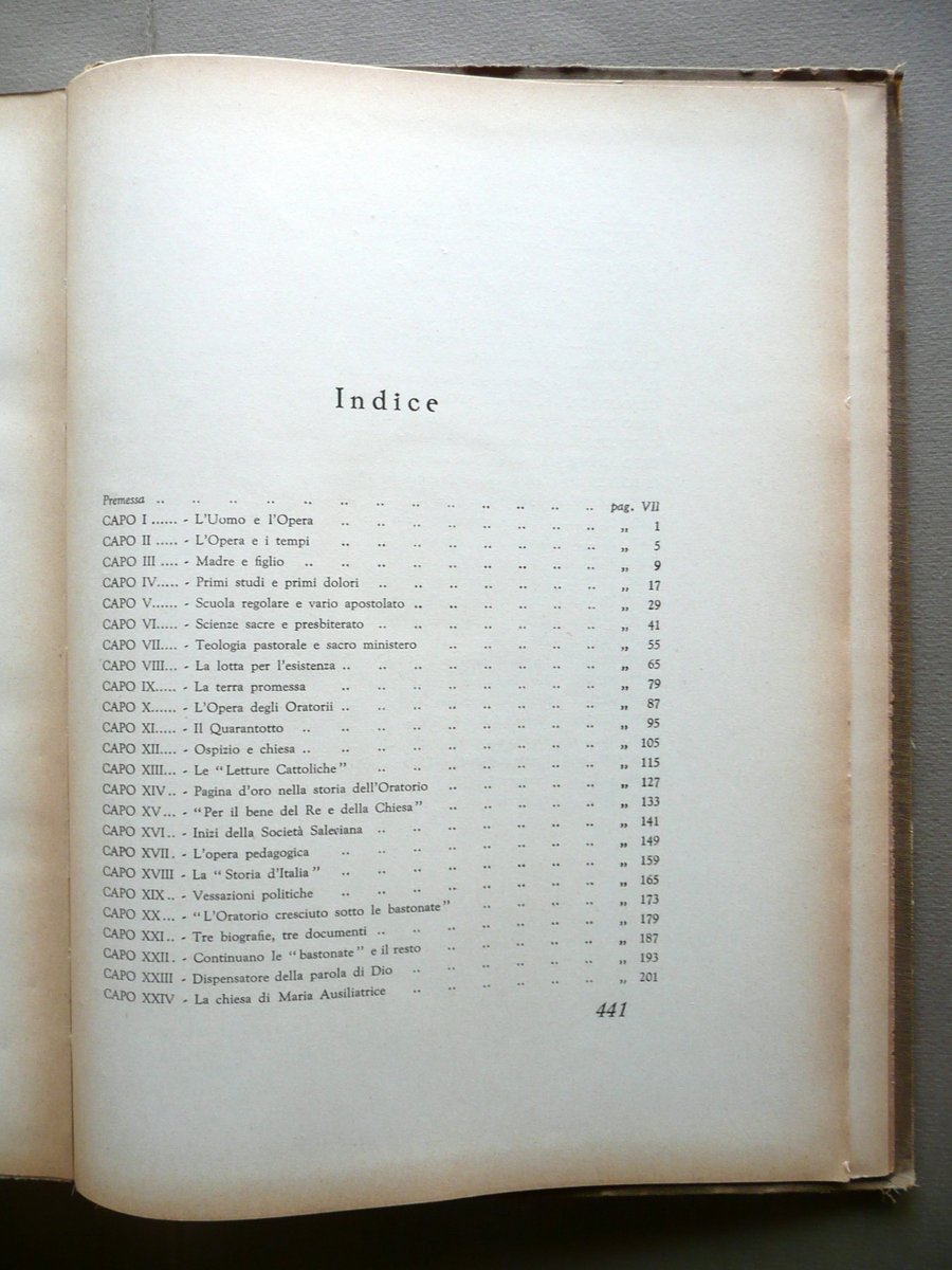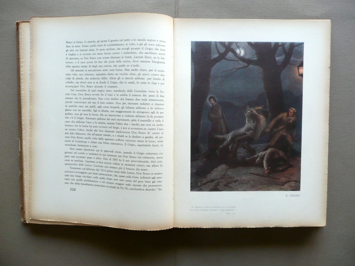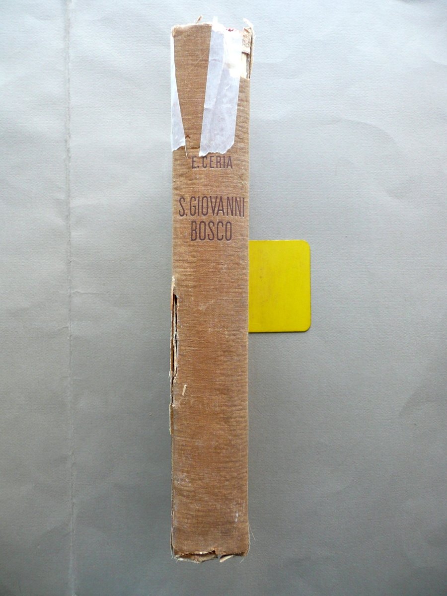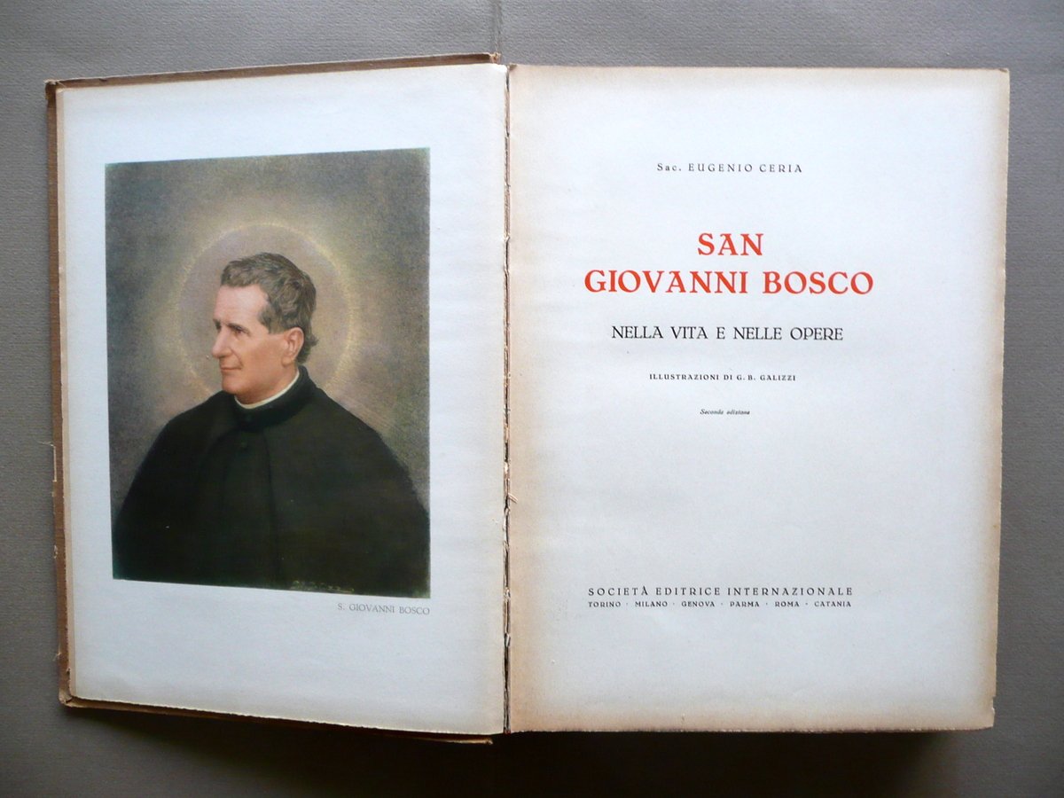 Ceria sac. Eugenio, San Giovanni Bosco" - nella vita e nelle opere- Società Editrice Internazionale, Torino, 1949; 32x24,5 cm; 442 pp. con ill. a colori f. t. di G. B. Galizzi, carta spessa, margini pizzettati, tutta tela con titoli anche al dorso. Condizioni di conservazione Esemplare complessivamente in buono stato con tracce d'uso, angoli e margini sup. dei piatti con minime mancanze, dorso lievemente ingiallito e con qualche circoscritta mancanza e strappetti, di cui due alla parte sup. restaurati con nastro adesivo (vedi foto); interni buoni; cerniere interne fessurate con conseguente leggero allentamento delle cuciture di alcuni fascicoli. SETT39.L3288 "