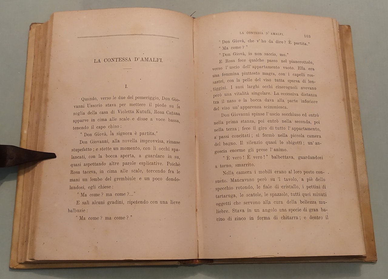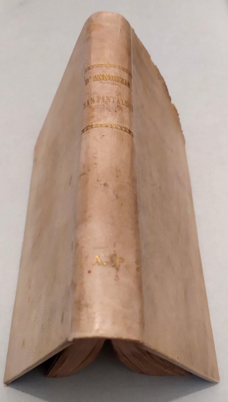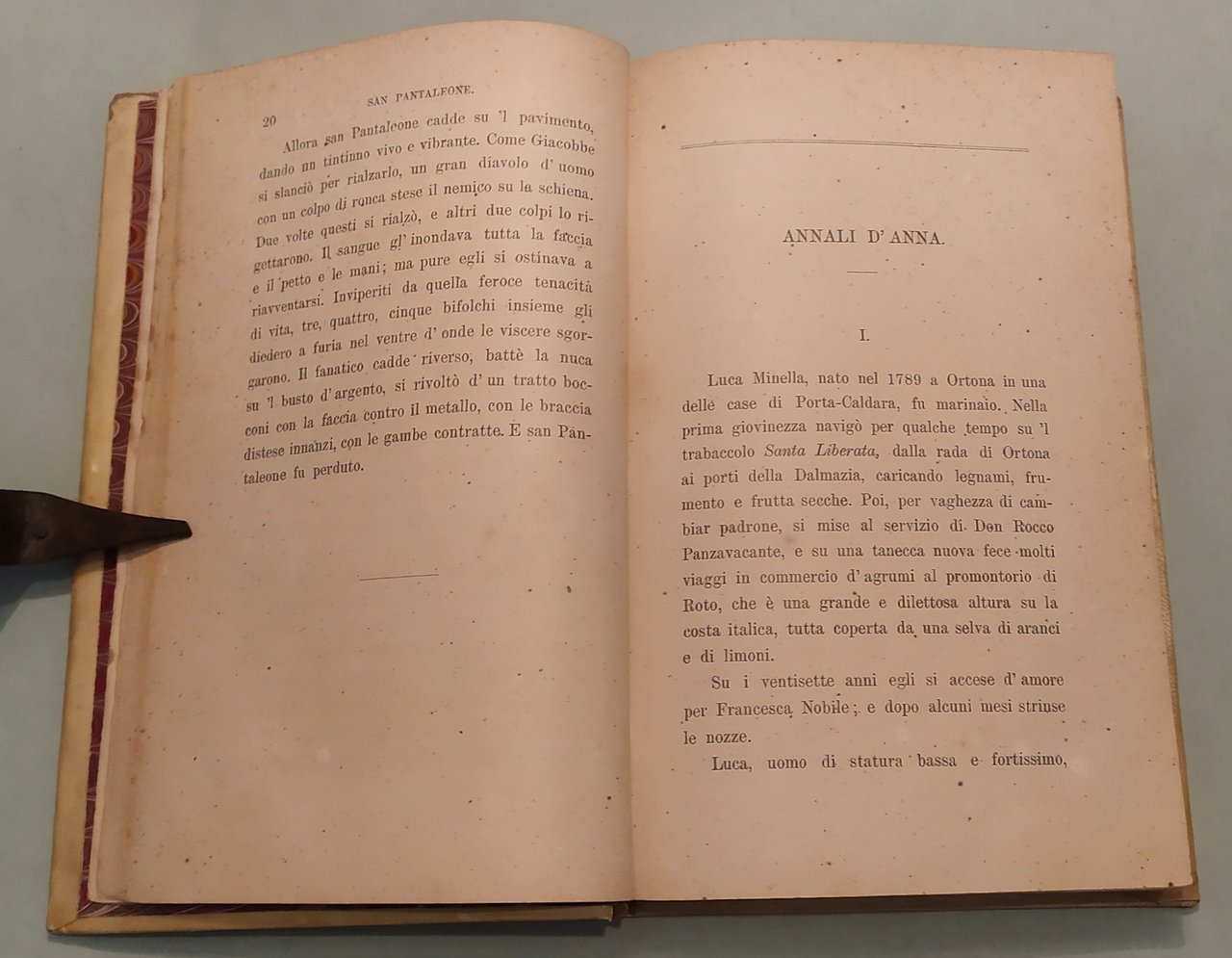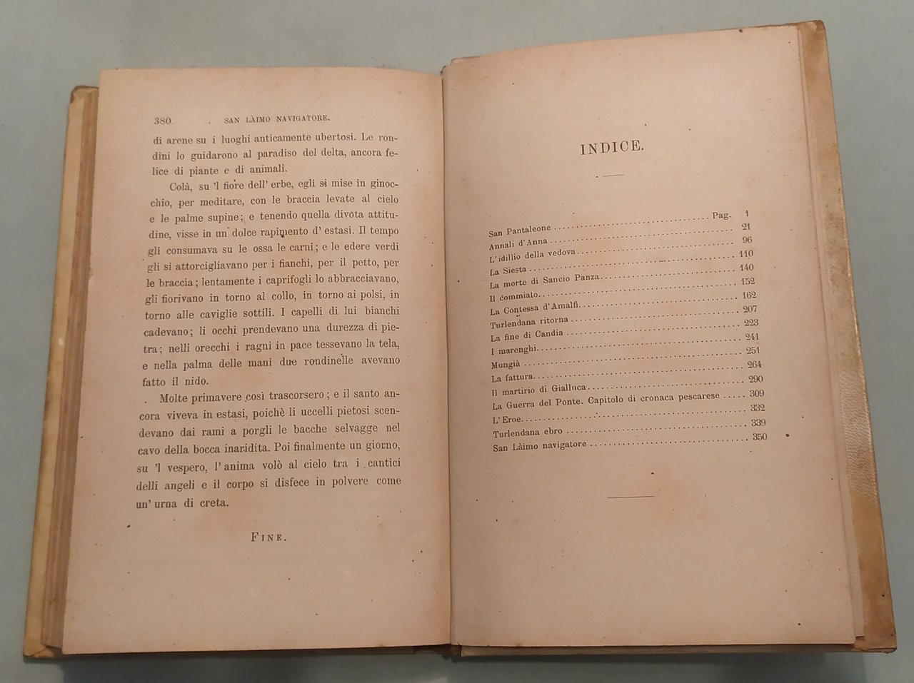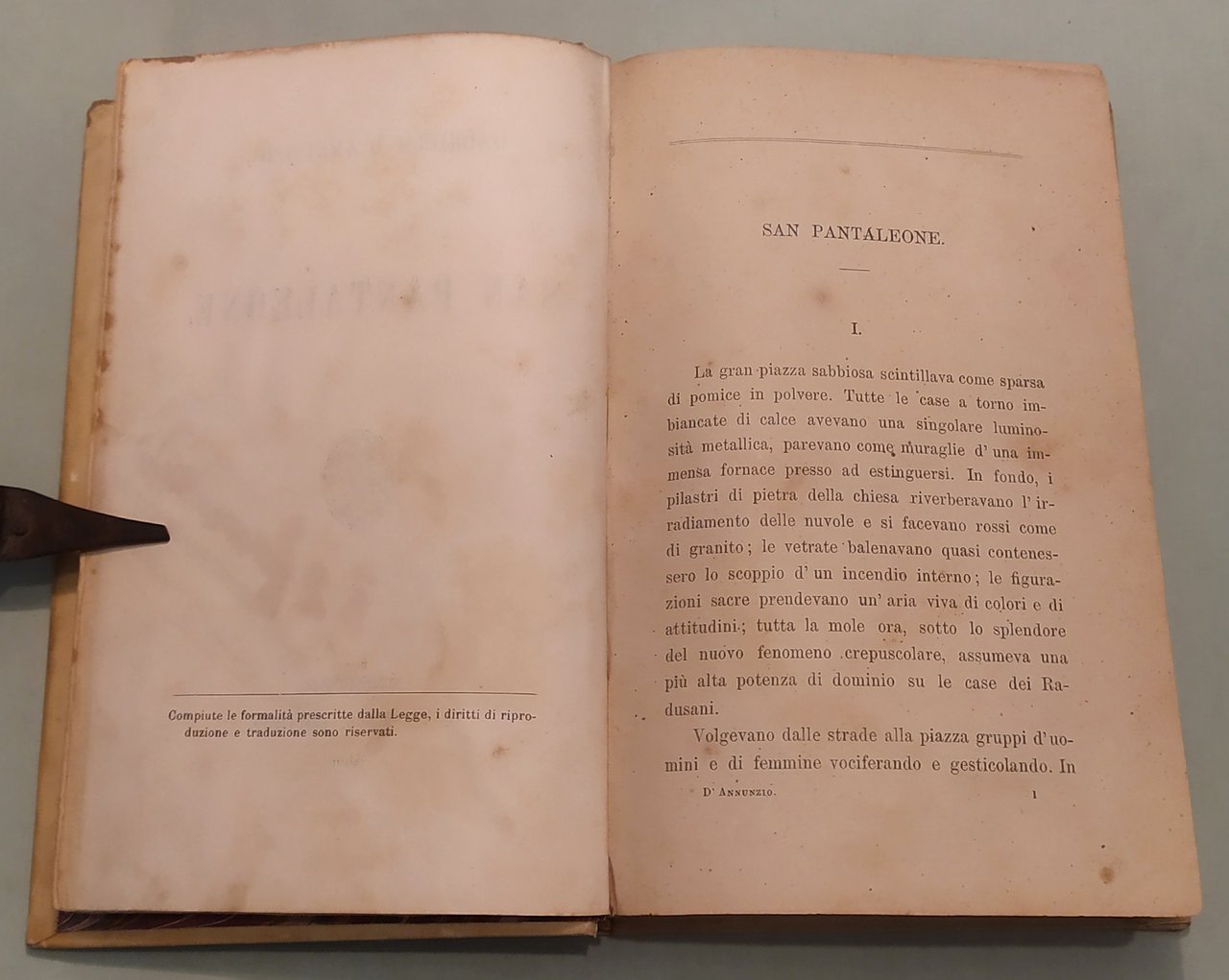 D'ANNUNZIO Gabriele. San Pantaleone. Firenze, Barbera, 1886. In 8vo; pp. 380 ed una di index. Raccolta di 17 novelle, in parte e successivamente ristampate con varianti ne “I Violenti”, “Gli Idolatri” e “Le novelle della Pescara”; “Il Commiato” fu inserita quasi integralmente nel romanzo “Il Piacere”. Pergamena coeva, titolo in oro al dorso. Edizione originale. De Medici, 13.