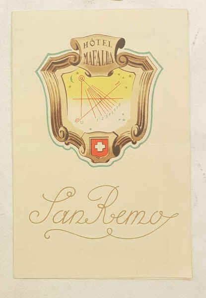 Pieghevole di 4 facciate di cm. 19,5 x 12,5; con alcuni disegni in nero in cornice a colori; copertina grafica a colori con stemma dell'hotel. Minima traccia di piega. VG. ** Su carta forte. Direttore: Ernesto Budi Speiser.