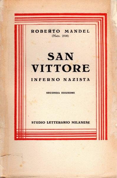 San Vittore inferno nazista, seconda edizione 1945, pp. 207, formato 13 x 19,5.<BR>Copertina morbida di colore beige con titoli in nero al piatto anteriore e sul dorso. All'interno presente bella dedica dell'autore. <BR>Restauro e rinforzo del dorso. Volume in buono stato di conservazione. <BR>
