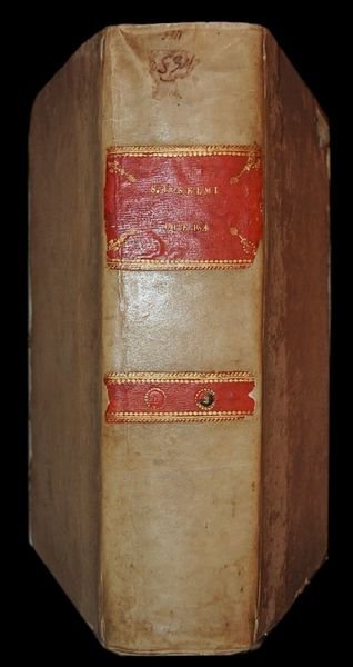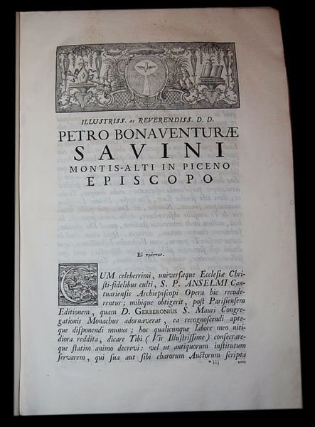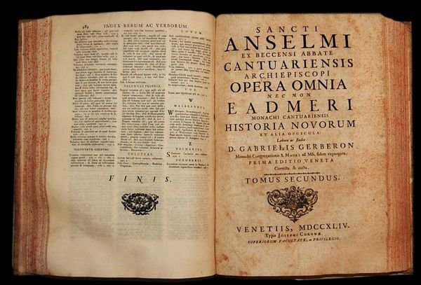 In folio (37,5x25 cm); due tomi in un volume: (12), XL, 484 pp. e una c. di tav. fuori testo in antiporta con bellissimo ritratto di Sant'Anselmo, XXIV, 366, (2), 243, (1) pp. Bella legatura coeva in mezza pergamena con titolo in oro al dorso su fascetta rossa. Good copy, very rare. Piatti foderati con carta coeva (qualche leggera strofinatura). Tagli spruzzati in rosso. All'interno in ottime condizioni di conservazione e con ampi margini. Prima edizione veneziana stampata da Giuseppe Corona curata dal noto benedettino giansenista originario di Saint-Clais (Maine), Gerberon Gabriel pubblicate per la prima volta a Parigi nel 1675. Frontespizio del primo volume in rosso e nero, numerosissimi testatine, finalini e iniziali xilografici. Testo in colonne doppie. Celebre e monumentale raccolta del pensiero del celebre padre della Chiesa Cattolica S. Anselmo di Canterbury (1033-1109) nato a Aosta, in Piemonte. Dopo aver studiato in Borgogna e in Francia, entrò nell'ordine benedettino. Divenne arcivescovo di Canterbury nel 1093 carica che ricoprì fino alla morte. Teologo e filosofo molto ammirato è considerato fra i padri della scolastica ed è conosciuto per la sua tesi ontologica dell'esistenza di Dio, dimostrata nel suo Proslogion (1077-1078). Si schierò fortemente contro l'anti-intellettualismo, insistendo sul fatto che l'analisi razionale della fede cristiana non conduce necessariamente allo scetticismo. Al contrario, credeva che lo studio intelligente avrebbe portato ad una migliore comprensione della fede rendendola più forte. Fu canonizzato nel 1494 e nominato Dottore della Chiesa nel 1726. Doctor magnificus, come viene anche chiamato, scrisse numerose opere. L'opera più famosa del periodo inglese (terminata, però in esilio in Italia, sull'eremo benedettino di Villa degli Schiavi, l'antica Villa Sclavia, oggi Liberi in Provincia di Caserta) fu il Cur Deus homo (Perché un Dio-uomo?). Anselmo ci ha lasciato anche un'ampia raccolta di Preghiere e di Meditazioni, nonché un nutrito Epistolario, qui presentato, nel quale sono raccolte anche numerose lettere dirette ai suoi discepoli per i quali il Santo fu sempre una figura di riferimento estremamente attenta e gentile. Questa edizione veneziana estremamente curata contiene anche la Vita di Sant'Anselmo. Questa edizione è considerata fra le più corrette e complete mai stampate delle opere del celebre Santo. Ottimo esemplare. Very good copy, rare.