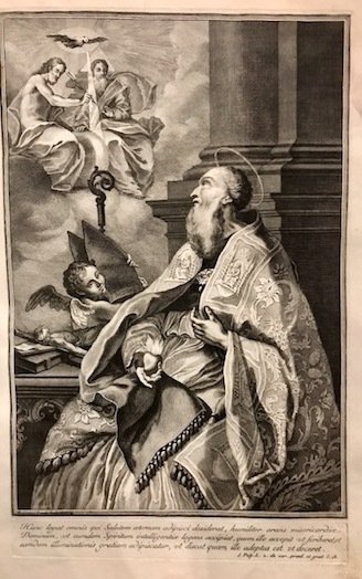 Folio (cm. 38,5), 10 cc.nn., 888 colonne. Ritratto di Sant’Agostino inciso da Francesco Zucchi in antiporta. Frontespizio in rosso e nero con vignetta calcografica. Ritratto del doge Alvise Pisani cui l’opera è dedicata. Belle testate calcografiche, num.si capiletttera e fregi xilografici n.t. Testo su due colonne. Cartonato coevo (leggermente allentato). Esemplare di assoluta freschezza ed in ottimo stato di conservazione. Solo questo primo Tomo degli undici di cui si compone questa edizione dell’opera omnia di Sant’Agostino. Oltre ai tredici Libri delle Confessioni, in questo primo tomo sono presenti il De Libero Arbitrio, il De Vera Religione, il De Musica, il De Beata Vita, il De Immortalitate Animae, ecc.