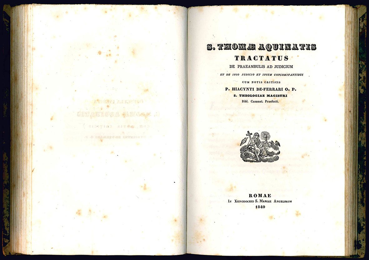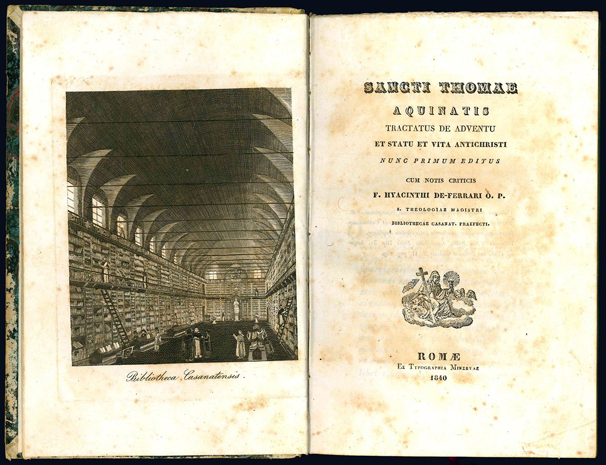 Sancti Thomae Aquinatis Tractatus de adventu et statu et vita Antichirsti. Nunc primum editus. Cum notis criticis F. Hyacinthi De-Ferrari O. P. S. Theologiae Magistri Bibliothecae Casant. Praefecti. (insieme con:) Tractatus de praeambulis ad judicium et de ipso judicio et ipsum concomitantibus cum notis criticis P. Hiacynthi De-Ferrari O. P. S. Theologiae Magistri Bibl. Casanat. Praefecti.