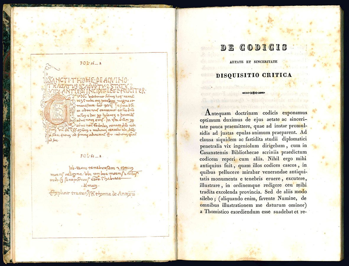 Il dotto editor Giacinto De Ferrari o. P. Prefetto della Bibl. Casanatense descrive il codice da lui trovato nella Biblioteca stessa fra altri del lascito di Benedetto XIII, cui era stato donato da Fr. Trevisan vescovo di Verona, nella disquisitio critica all'inizio del volume; egli lo data, in base a criteri paleografici, al 1300 circa. Oggi le due opere non sono più attribuite a San Tommaso.