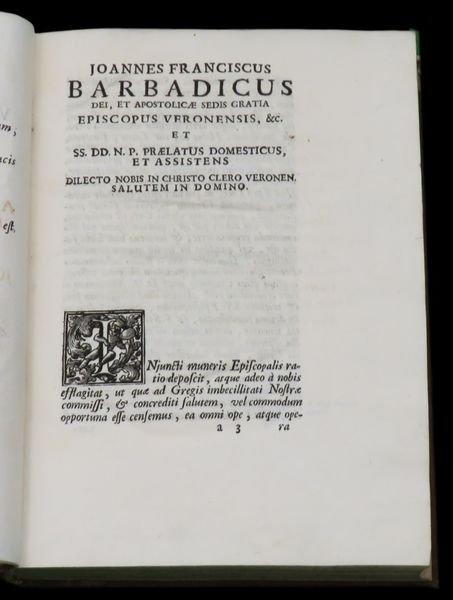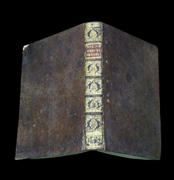 In 4° (24x17 cm); due tomi in un volume: (32), 344 pp. e 77, (3) pp. Bella ed elegante legatura coeva in piena pelle scura con dorso a 5 nervi. Ai tasselli titolo e ricchissimi fregi in oro. Tagli spruzzati. Una piccolissima spellatura allangolo alto del piatto anteriore, ininfluente e nel complesso, esemplare in ottime condizioni di conservazione. Primo frontespizio in rosso e nero. Prima rarissima edizione nellelegante versione stampata da Giovanni Manfrè a Padova e Verona, di questa raccolta di tutti i sermoni dellottavo vescovo di Verona e santo, Zeno, o Zenone (Mauretania, 300 circa Verona, 12 aprile 371). Zeno Fu vescovo di Verona dal 362 al 371 o 372 o 380, anno della sua morte. Secondo le fonti agiografiche visse in austerità e semplicità, tanto che pescava egli stesso nell'Adige il pesce per il proprio pasto. Per questo è considerato protettore dei pescatori d'acqua dolce. Era comunque persona colta ed erudita, formatosi alla scuola di retorica africana, i cui maggiori esponenti furono Apuleio di Madaura, Tertulliano, Cipriano e Lattanzio. Sono giunti fino a noi numerosi suoi sermoni, di cui 16 lunghi e 77 brevi, che testimoniano come egli, nella sua opera di evangelizzazione, si confrontò con il paganesimo ancora diffuso e si applicò per confutare l'arianesimo. La seconda parte dellopera contiene, con frontespizio proprio l"Historia di S. Zeno, Vescovo di Verona, et martire, raccolta per Don Battista Peretti". Peretti, soavese di nascita, fu insigne studioso ed autore di numerose pubblicazioni. Amico di uomini raffinati e colti, bibliofilo competente ed appassionato, fu anche un ricercatore di prim'ordine poiché alcune opere da lui pubblicate servirono poi agli studi sulla storia della chiesa scaligera. La sua vita di San Zeno è considerata una delle massime fonti agiografiche del santo e nella sua compilazione, il Peretti fece ampie ricerche darchivio. Esemplare in perfette condizioni di conservazione di edizione rara. Rif. Bibl.: WorldCat, OCLC Number 797727167.