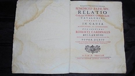 SANCTISSIMO DOMINO NOSTRO BENEDICTO PAPAE XIV RELATIO CAROLI ALBERTI CARDINALIS CAVALCHINI PONENTIS IN CAUSA BEATIFICATIOJNIS, ET CANONIZATIONIS VEN. SERVI DEI ROBERTI CARDINALIS BELLARMINI. PRO CONGREGATIONE HABENDA CORAM SANCITATE SUA SUPER DUBIO AN CONSTET DE VIRTUTIBUS THEOLOGALIBUS.