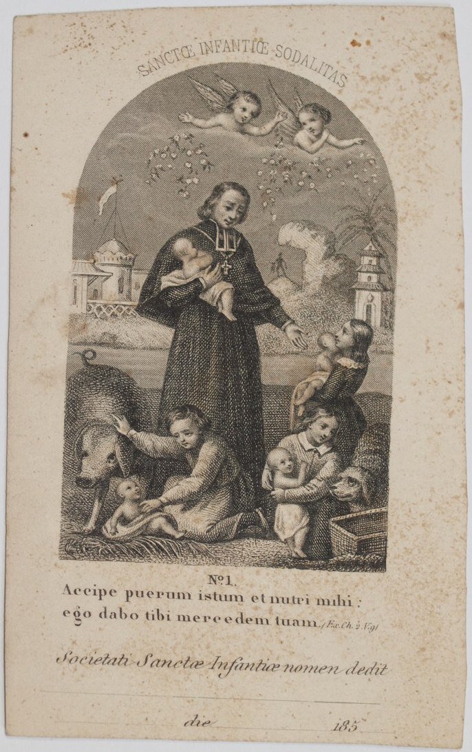 Immaginetta sacra del 1850 circa da donare a una persona in particolare (spazio vuoto da compilare) della Società della Santa Infanzia. Al verso testo scritto tagliato male. In buone condizioni. In 24. Dim. cm 10,5x6,5. Holy image of 1850 circa to be given to a person in particular (empty space) of the Società della Santa Infanzia. In the verso written text but badly cut. In good conditions.