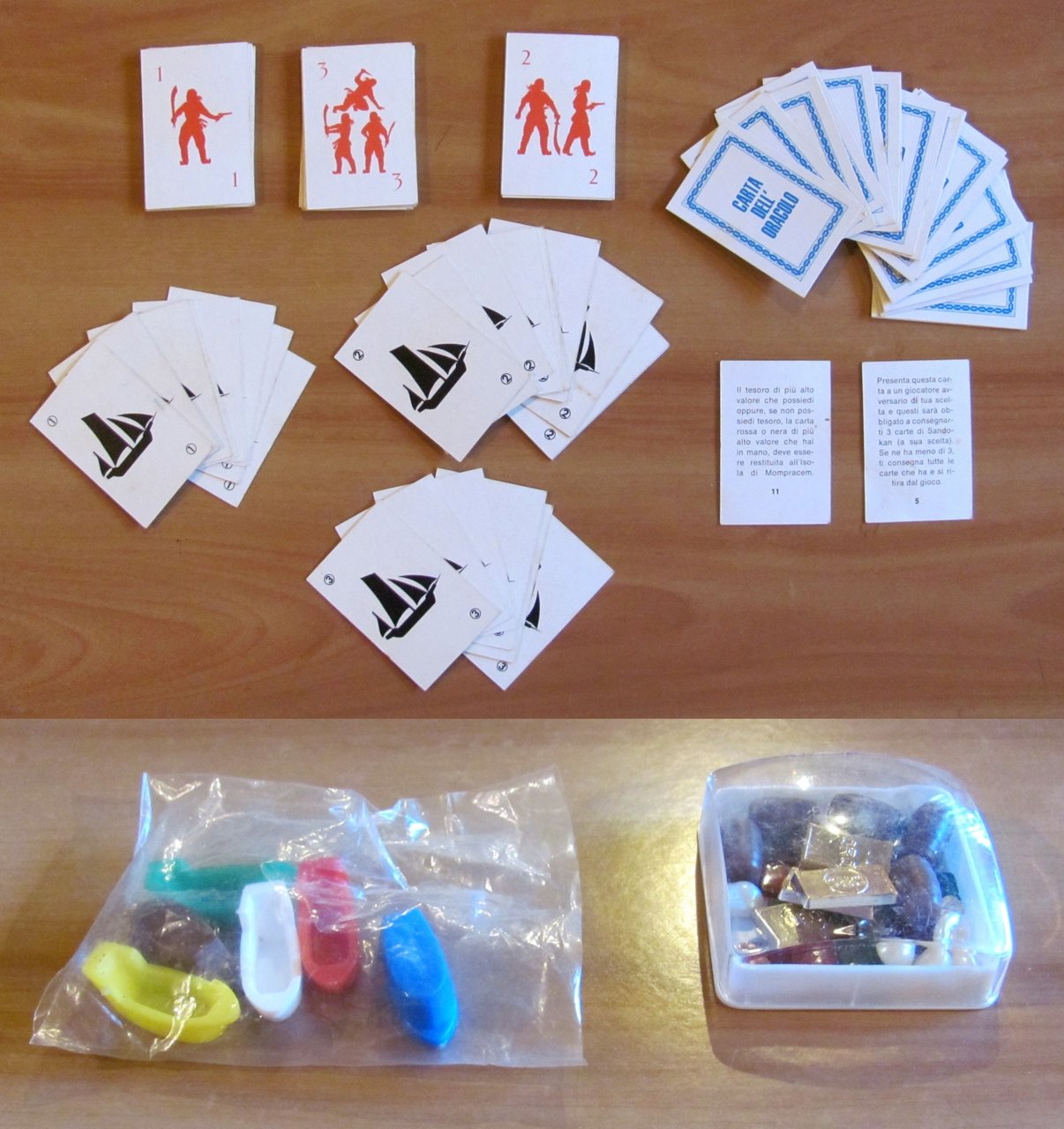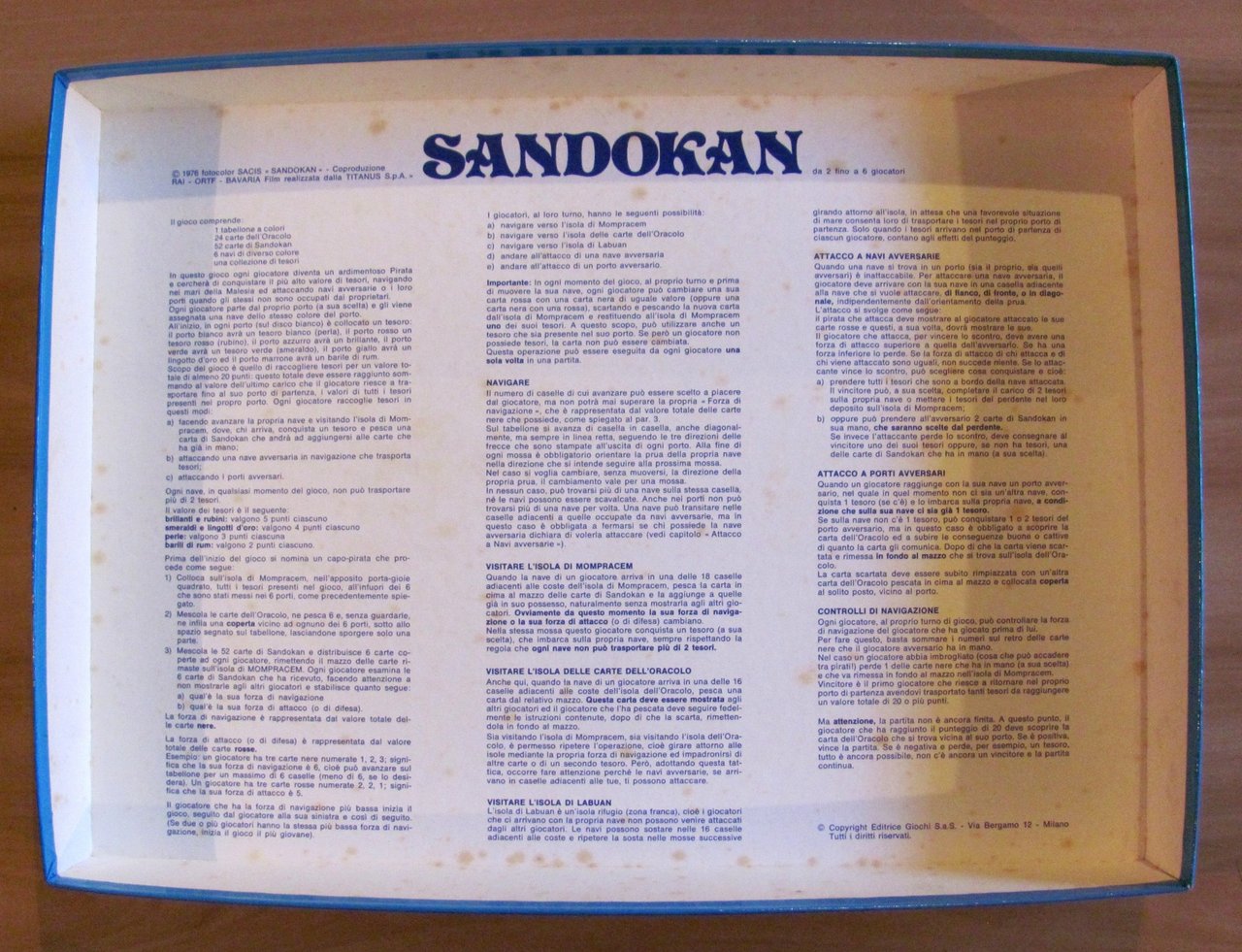 Scatola in cartone originale contenente: 1 Tabellone, ripiegato 2 volte, a colori; 22 carte (su 24) Carte dell'Oracolo; 50 (su 52) Carte di Sandokan rosse e nere; Bustina sigillata con 6 Navi (pedine) di diverso colore; 1 Collezione di tesori, in scatolina originale, integra. Istruzioni all'interno del coperchio. Edizioni Giochi - Milano, 1976. Scatola in cartone originale. Tabellone 64,5x44,5; Scatola 46x33,5x5. Raro e in Ottimo stato. , Ottimo (Fine)