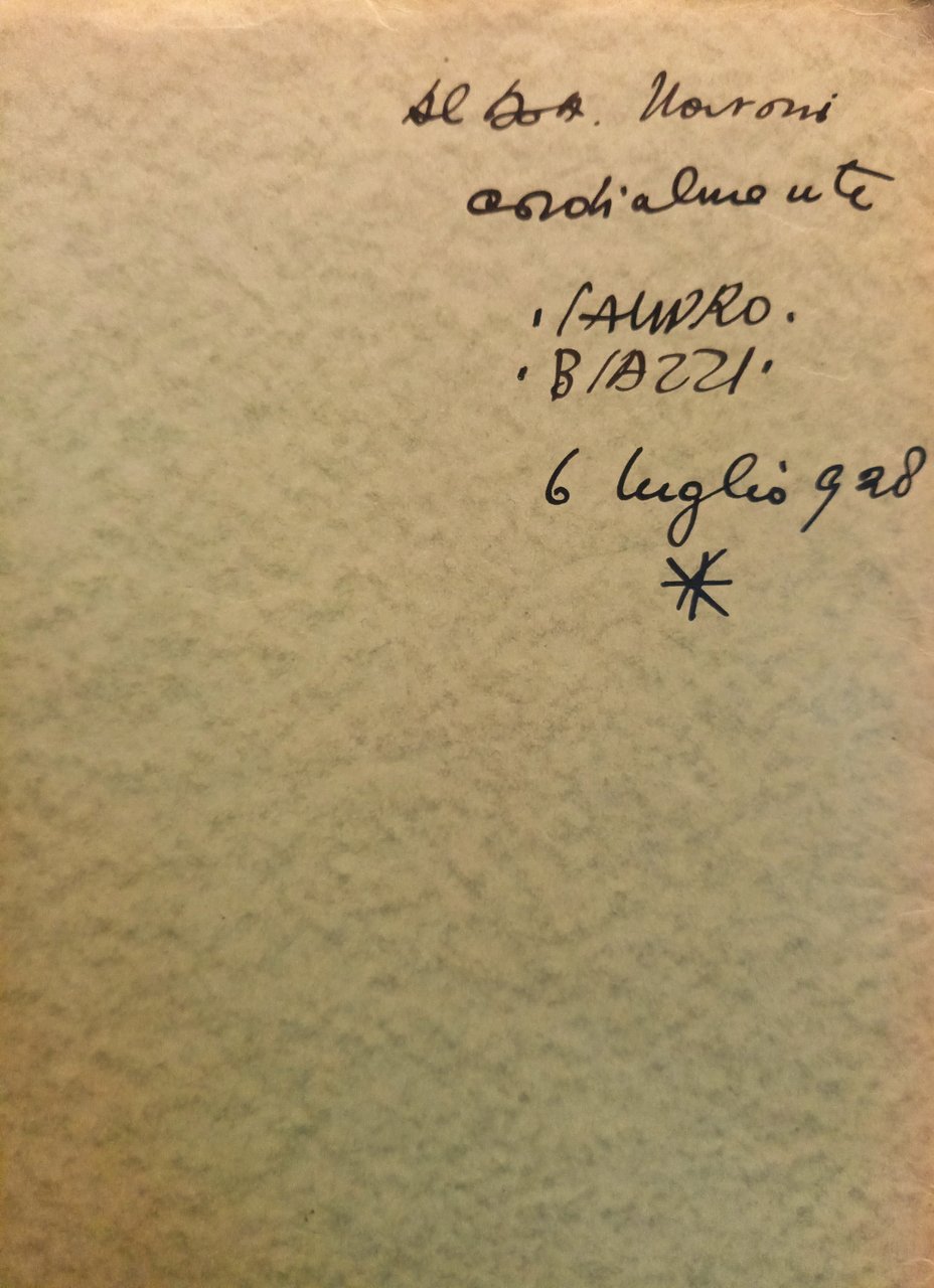 I ed.. Di questa edizione sono state stampate 107 copie contenenti una acquaforte originale: questa è una edizione non numerata, senza acquaforte originale. Collezione "Pittura e Scultura d'Oggi", vol. n. 6. "Zincografia Milano". Cartellina in-4^ in cartoncino martellato grigio-verde con titoli in nero e illustrazione in arancione su fondo chiaro del Biazzi contenente un fascicolo pinzato al dorso di 16 pp. (con la prefazione, il saggio critico e l'indice delle tavole e 10 illustrazioni in b/n)+16 tavole in carta patinata con illustrazioni in b/n+2 tavole con illustrazionii a colori). Dedica ad inchiostro nero dell'artista Sandro Biazzi nel risvolto della coperetina. Stato buono (stato d'uso della cartellina che si presenta consumata e ingiallita ai margini e al dorso, con in particolare una riparazione in tessuto verde oliva al margine inferiore del sedcondo piatto della copertina stessa - pagine e tavole brunite e con qualche fioritura). Illustrazioni tavole (2 a colori e 16: Nudi femminili (Tricromia) - La strada provinciale (Tricromia) - Shangkyu e due altre donne seminude - Giovinetta nuda - Quadro profano - Confidenze - Conversazione - "Hanno ucciso compare Turiddu" - I carabinieri Orzinuovi - Passeggiata domenicale - La vela - La basilica di Sant'Ambrogio - Montagne rosse - La capretta - Il fotografo - Pioggia - La torre rossa - Il musicante di Malè - Pendii di Rabbi (Bozzetto) - Case di Bolentina (Bozzetto) - Casa colonica di Malè (Bozzetto) - Case di Croviana (Bozzetto). Indice: Prefazione; Alessandro Varaldo - "Sandro Biazzi"; (con 10 illustrazioni in b/n nel testo); Raffaello Giolli - Indice delle Tavole.