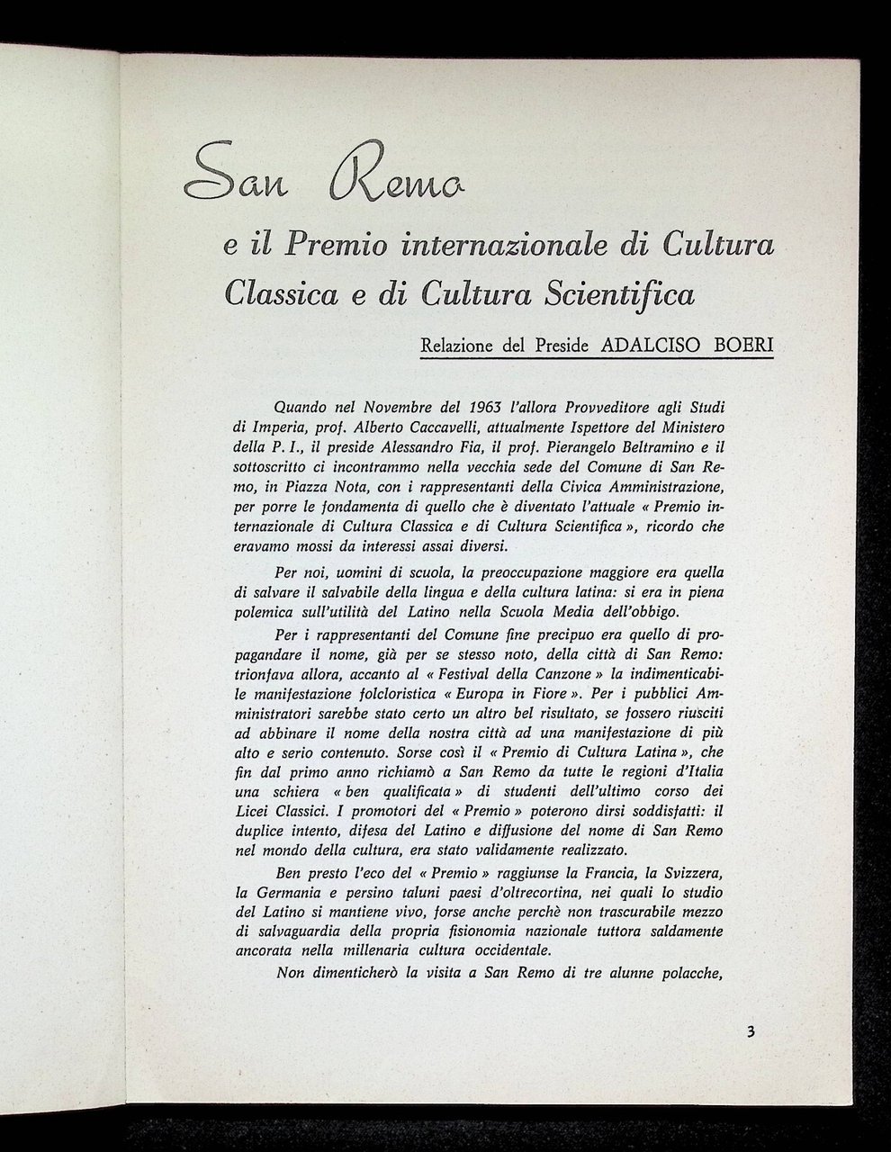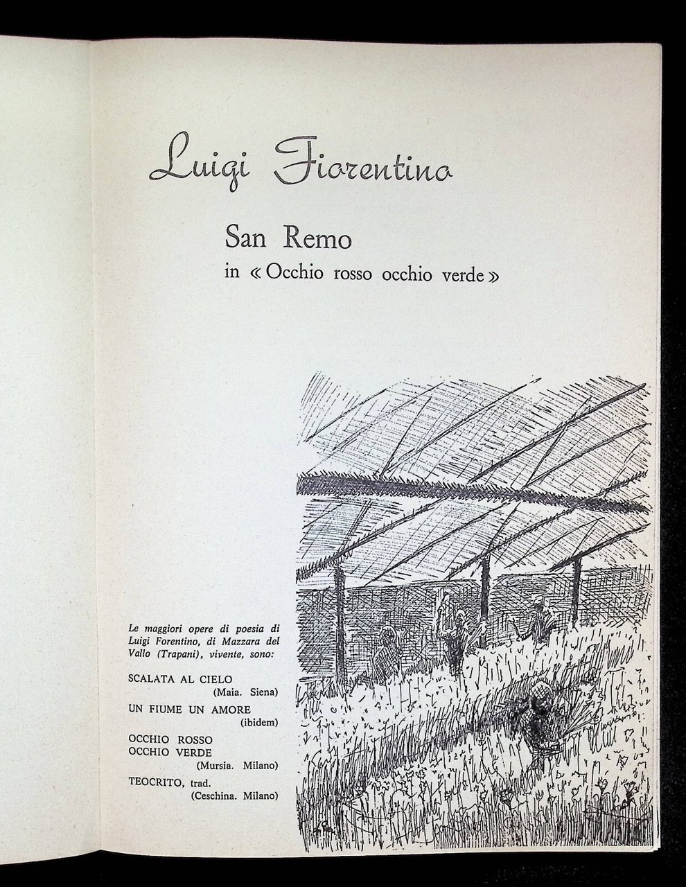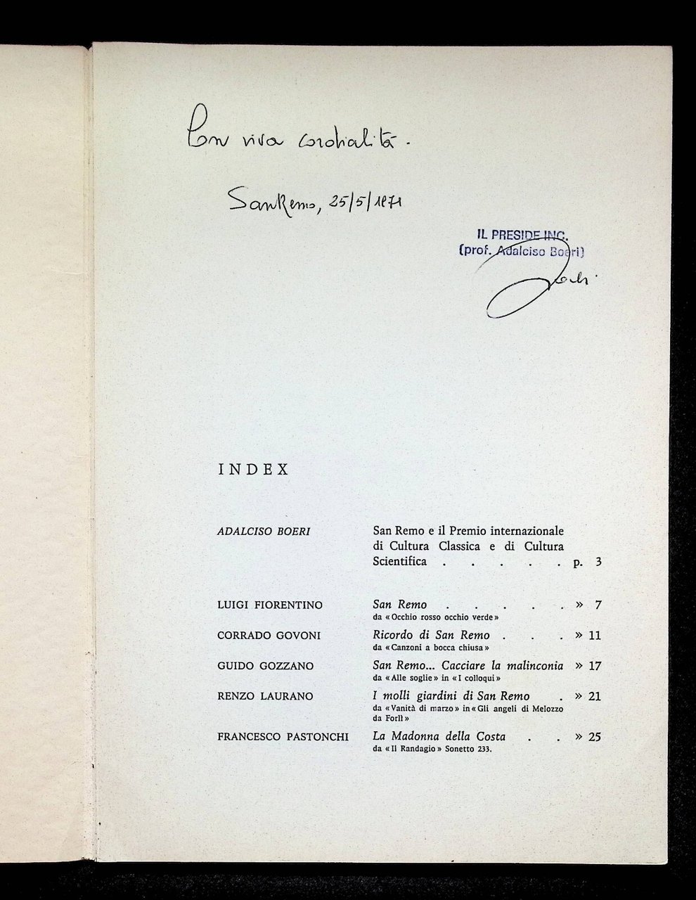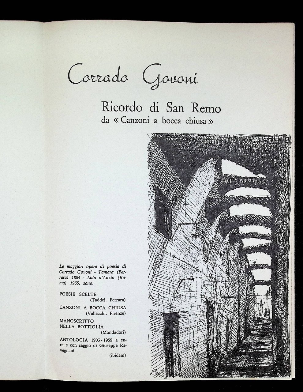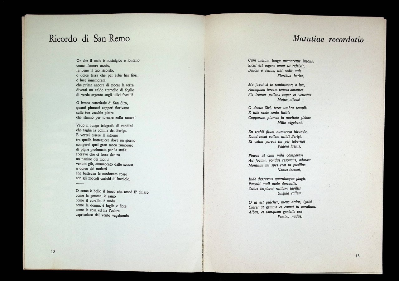 San Remo cantata nella poesia italiana contemporanea da Fiorentino, Govoni, Gozzano, Laurano, Pastonchi Versione in latino di Giuseppe Zappa Tavole di Lorenzo Pieri Collana: Premio internazionale di cultura classica e scientifica "città di San Remo" Formato: in 8^, brossura, fascicolo di 28 pp. Data di Pubblicazione: 1971 Buone condizioni a parte qualche macchia del tempo