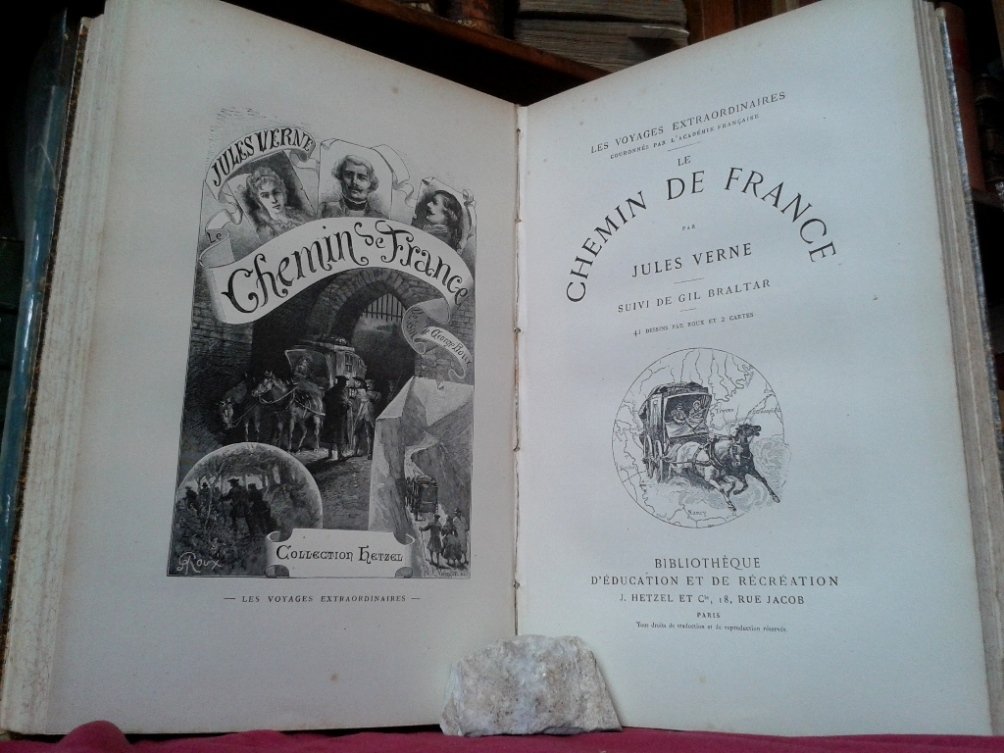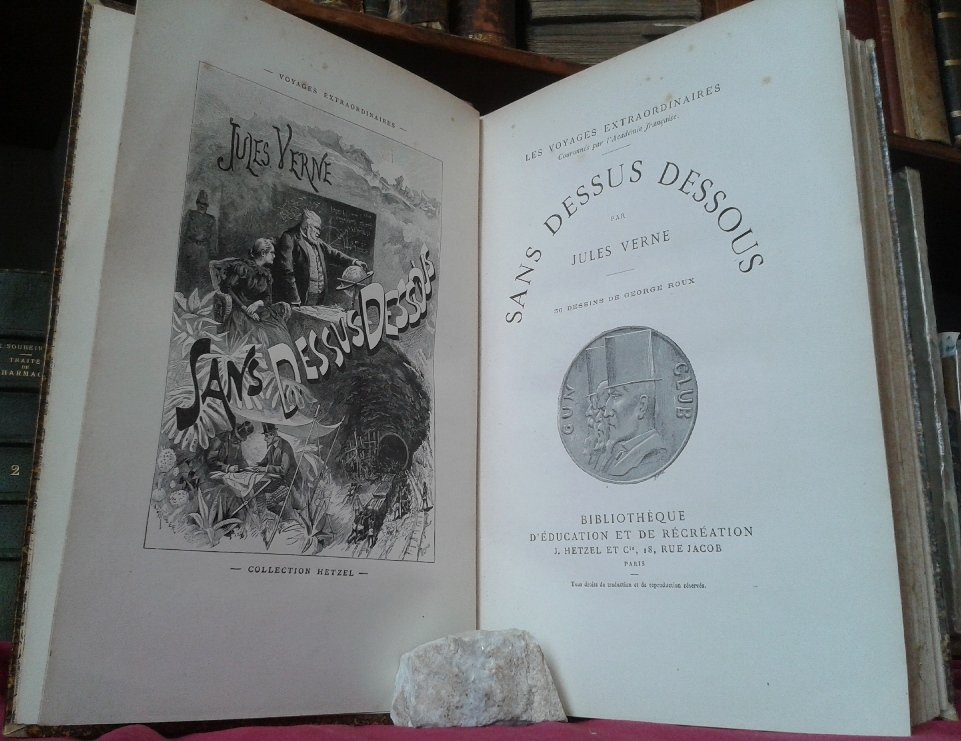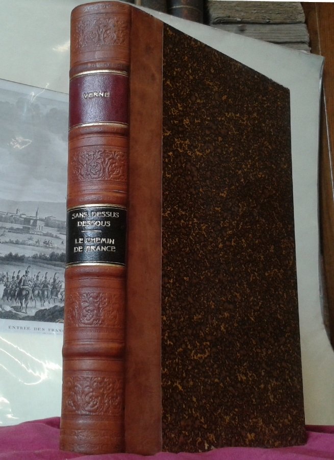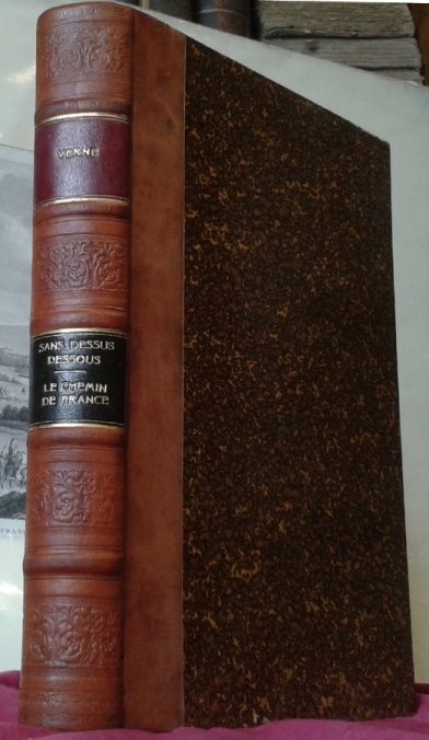 Volume in 4, legatura amatoriale in mezza pelle, titolo al tassello al dorso a cinque nervi, impresso a secco a scomparti, sguardie con decoro floreale, occhiello, frontespizio generale dell'opera contenente i due titoli, occhiello e doppio frontespizio per il primo romanzo, uno completamente figurato ed uno con vignetta incisa, (8) 204 pp., 36 illustrazioni n.t. di cui molte a piena pagina; occhiello e doppio frontespizio per il secondo romanzo, (4) 220 pp., 1 carta d'indice, bianca finale, 41 illustrazioni n.t. di cui molte a piena pagina. Due delle fantastiche avventure del grande narratore francese, dalla collana 'Les voyages Extraordinaires couronnes par l'Academie francaise', pubblicata da Hetzel, in bella edizione in 4 illustrata. In ottimo stato.
