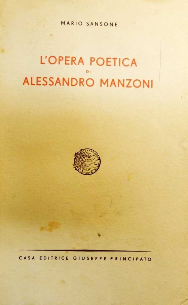 Mario Sansone, L’opera poetica di Alessandro Manzoni, Casa Editrice Giuseppe Principato, Milano-Messina 1947, pp. 332, cm 22, br. ed. Etichetta con segnatura di collocazione al dorso, brossura un po’ sporca con strappetti senza mancanze al dorso, una decina di carte con sottolineature e qualche annotazione a lapis, per il resto volume in buono stato e in parte intonso.