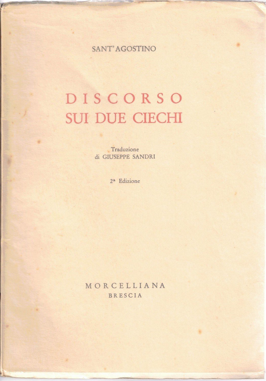 Sant’Agostino, Discorso sui due ciechi, premessa di Don Giuseppe De Luca, traduzione di Giuseppe Sandri, Morcelliana, Brescia 1951, seconda ed., pp. 55, cm 19, br. ed. con alette e velina di protezione. Collana Fuochi. Minime tracce d’uso, ordinari segni del tempo, per il resto ottimo esemplare.