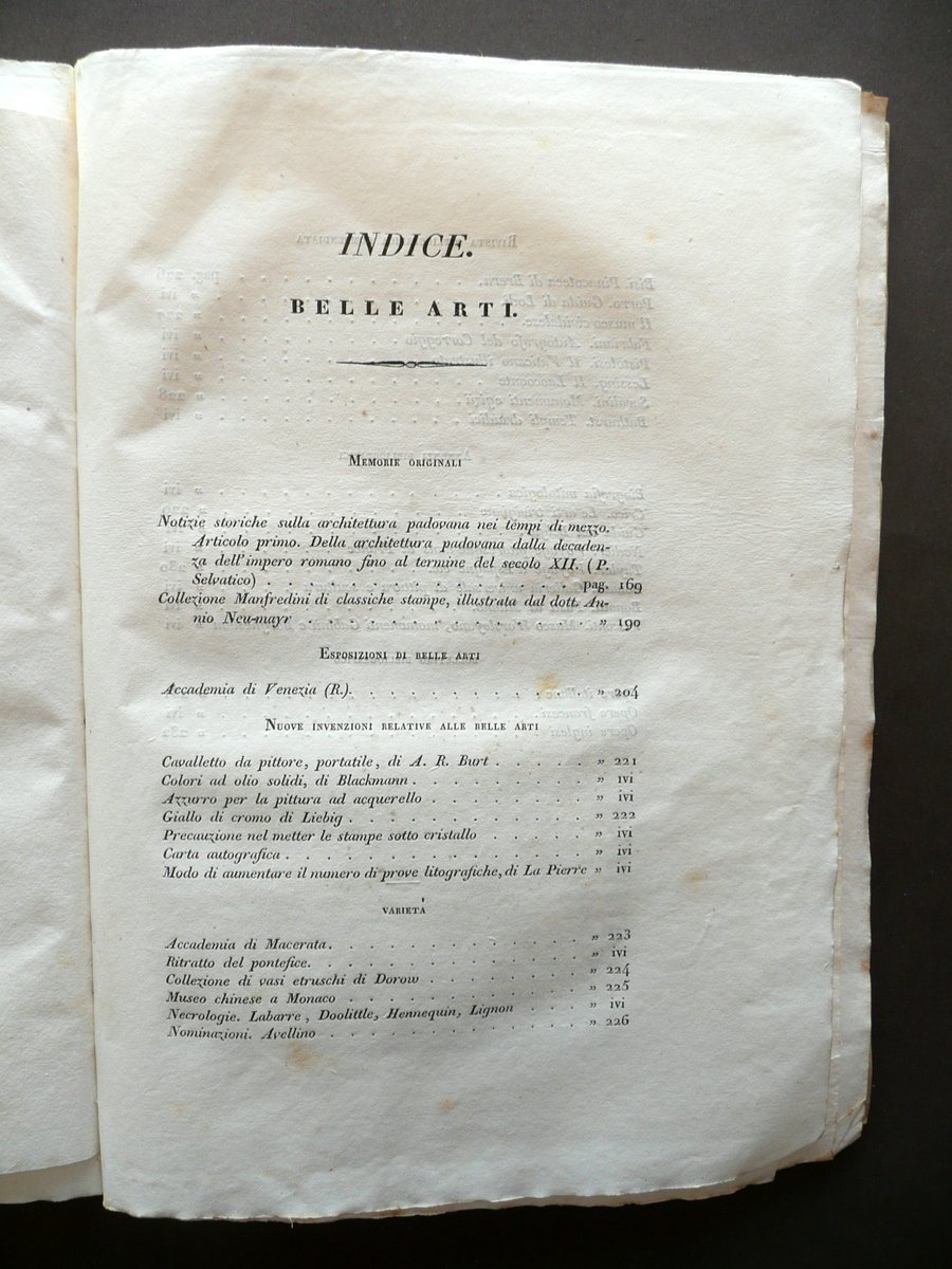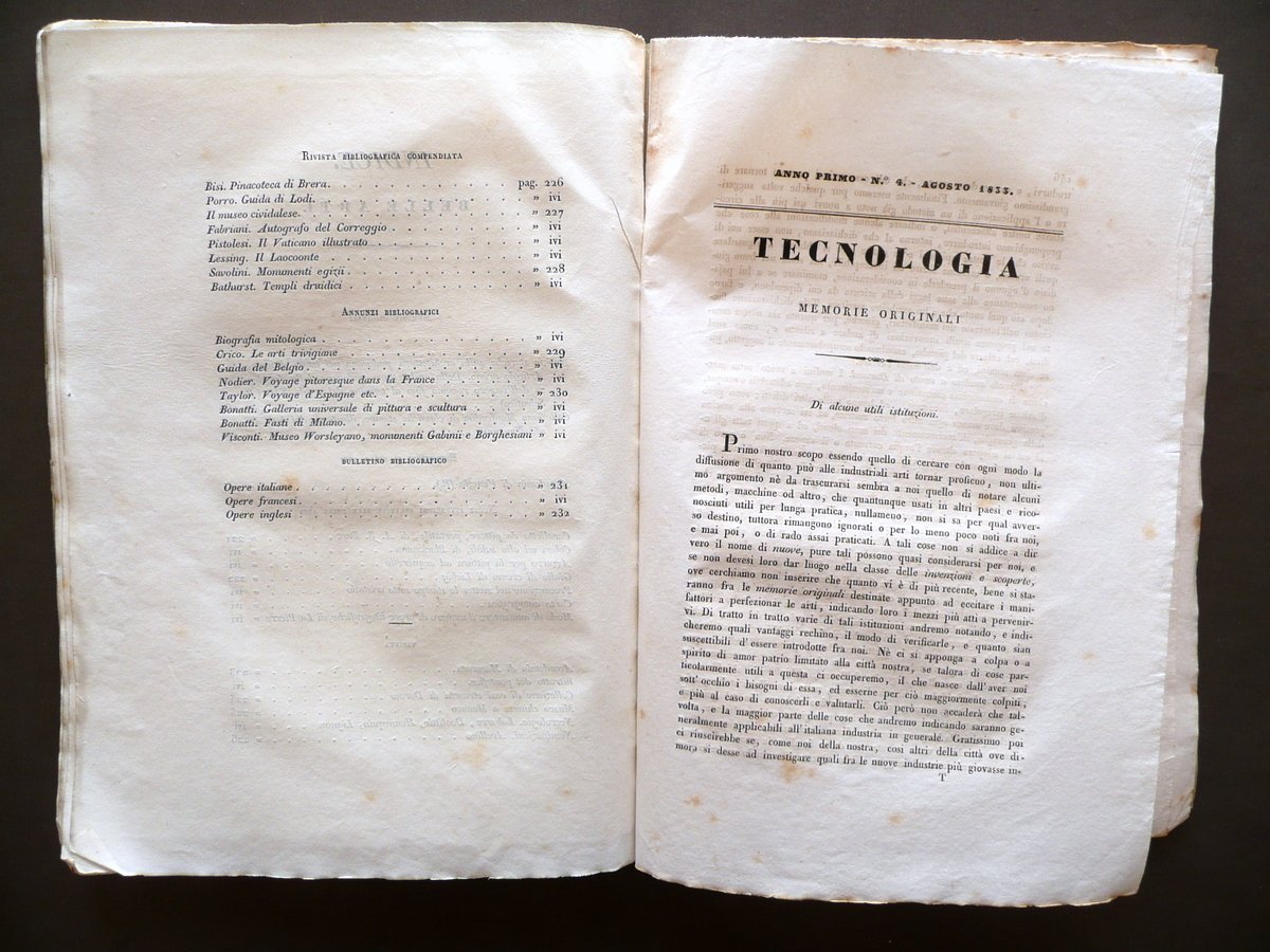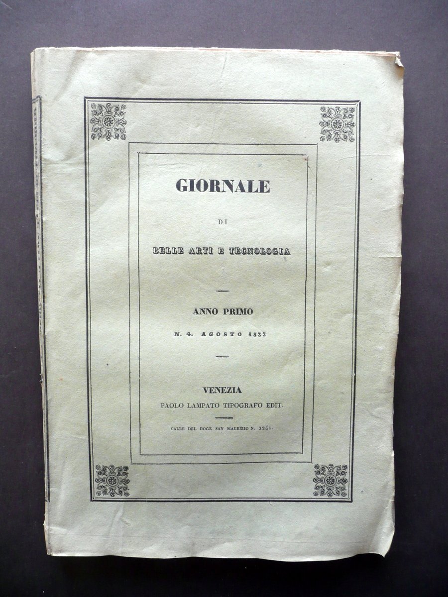 Giornale di Belle Arti e Tecnologia" Anno primo Numero 4 - agosto 1833 Paolo Lampato Tip. Editore, Venezia 1833; cm 24,5x17,5; da pagina 169 a pagina 234 (sezione belle arti); da pagina 145 a pagina 194 (sezione tecnologia), con tre tavole incise in b/n fuori t. (tutte e tre alla sezione belle arti); esemplare autonomo con numerazione progressiva. Brossura ed. d'attesa. Condizioni di conservazione Esemplare ben conservato con tracce d'uso e alcune piccole leggere bruniture, brossure con pressoché trascurabili accenni di sporco e qualche minuscola pieghetta agli angoli; dorso con pochissime minuscole mancanze. Interni buoni; margine int. delle pp. 208-209 con leggera apertura, esemplare compatto. Margini con barbe. Con tre belle tavole incise in bianco e nero fuori testo, tutte raffiguranti la Chiesa di S. Sofia in Padova (vedi foto). Per un elenco degli argomenti trattati vedi foto indici. SETT134.L13347 N "