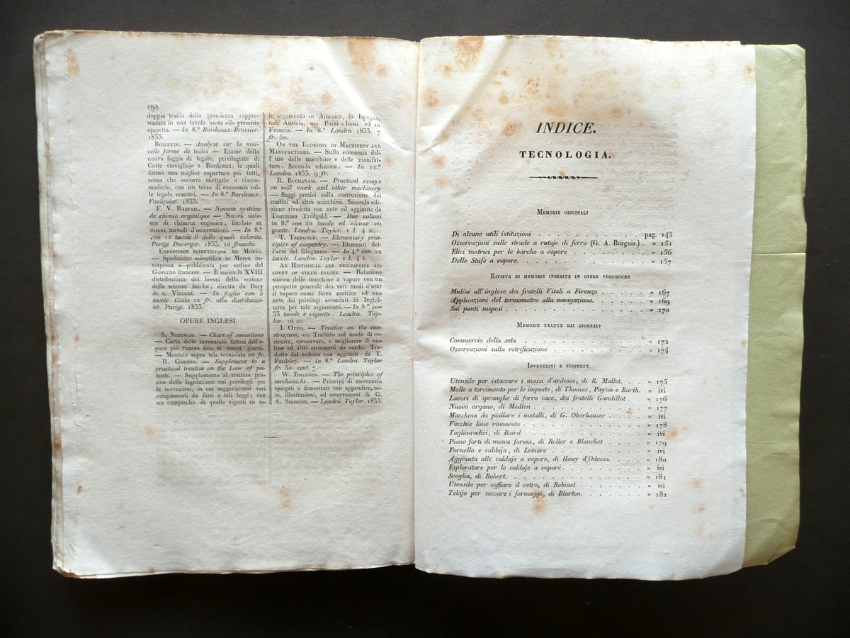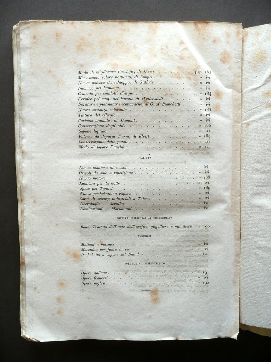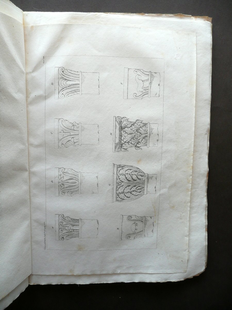 Giornale di Belle Arti e Tecnologia" Anno primo Numero 4 - agosto 1833 Paolo Lampato Tip. Editore, Venezia 1833; cm 24,5x17,5; da pagina 169 a pagina 234 (sezione belle arti); da pagina 145 a pagina 194 (sezione tecnologia), con tre tavole incise in b/n fuori t. (tutte e tre alla sezione belle arti); esemplare autonomo con numerazione progressiva. Brossura ed. d'attesa. Condizioni di conservazione Esemplare ben conservato con tracce d'uso e alcune piccole leggere bruniture, brossure con pressoché trascurabili accenni di sporco e qualche minuscola pieghetta agli angoli; dorso con pochissime minuscole mancanze. Interni buoni; margine int. delle pp. 208-209 con leggera apertura, esemplare compatto. Margini con barbe. Con tre belle tavole incise in bianco e nero fuori testo, tutte raffiguranti la Chiesa di S. Sofia in Padova (vedi foto). Per un elenco degli argomenti trattati vedi foto indici. SETT134.L13347 N "