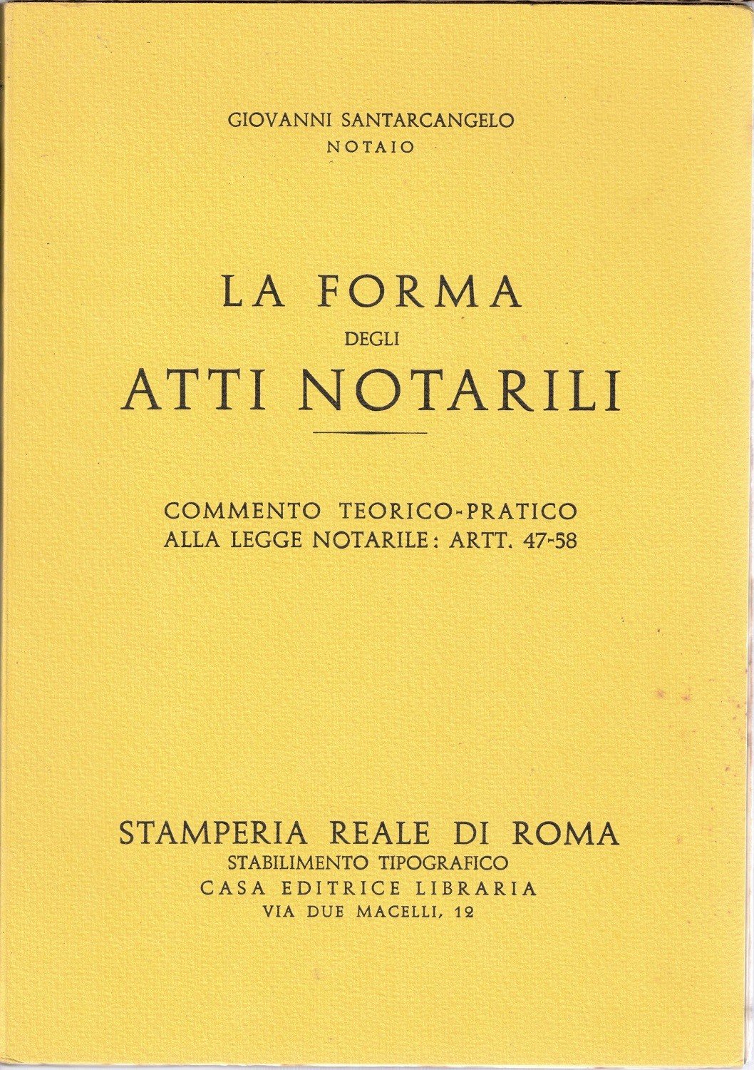 Giovanni Santarcangelo, La forma degli atti notarili. Commento teorico-pratico alla legge notarile: artt. 47-58, Stamperia Reale di Roma Stabilimento Tipografico Casa Editrice Libraria, Roma 1978, pp. 254, cm 25, br. ed. Lievi aloni di nastro adesivo a frontespizio e ultima carta, ordinari segni del tempo, per il resto ottimo esemplare.