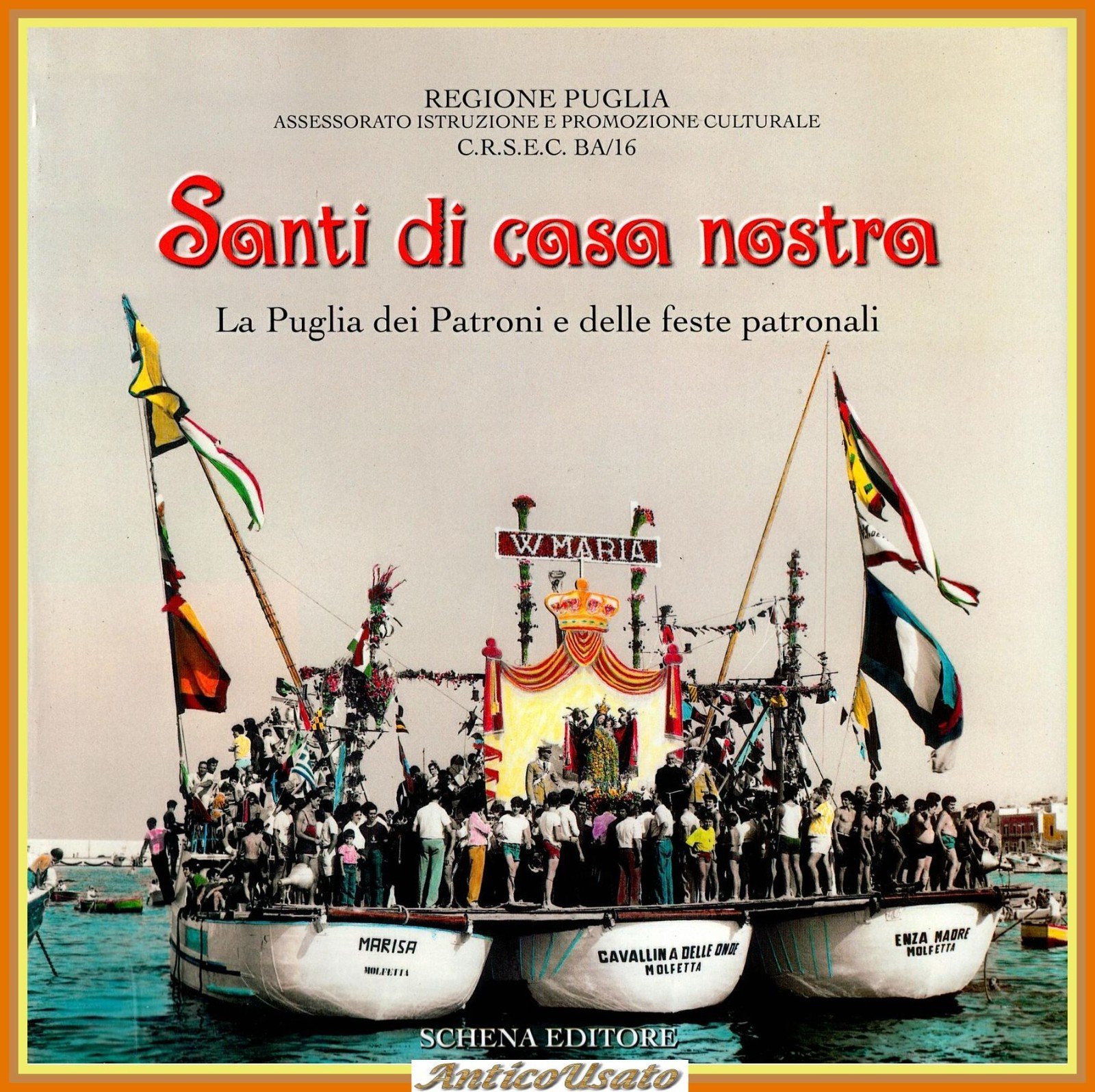 SANTI DI CASA NOSTRA La Puglia dei Patroni e delle feste patronaliRegione Puglia, Schena Editore, 2000 . 208 pagine, numerose fotografie monocromatiche e a colori fuori testo. Copertina editoriale in brossura. Stato di conservazione: QUASI NUOVO Libro usato saggistica STORIA LOCALE