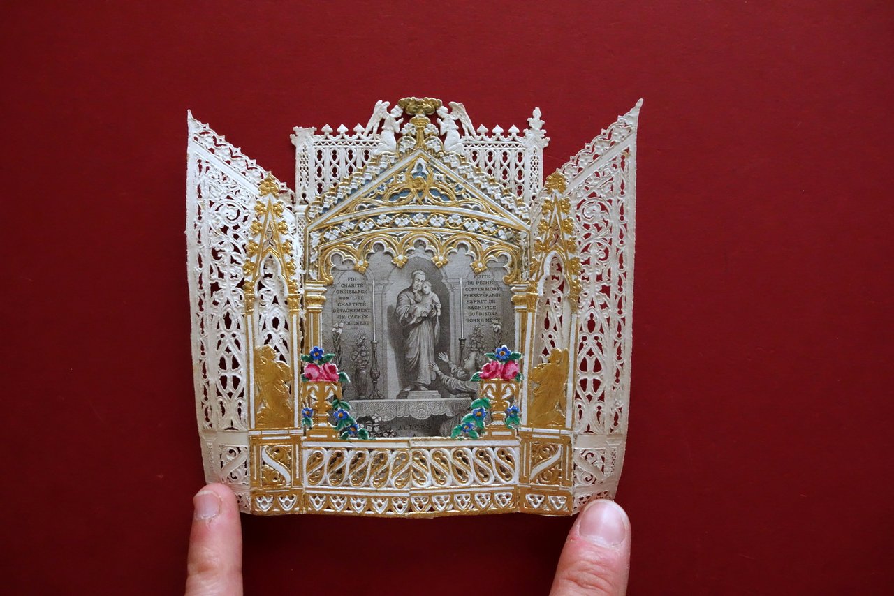 Santino traforato apribile, La devotion a Saint Joseph" - bel santino apribile, traforato, con dettagli in oro con bella illustrazione incisa in b/n seconda metà dell'Ottocento circa L. Turgis jeune, s. d. ma seconda metà dell'Ottocento circa; bel santino finemente traforato, apribile, con dettagli in oro e a colori; raffigurazione del Santo mediante bella tavola incisa in b/n e applicata; al retro didascalia liturgica in francese. Cm 11,5x7. Condizioni di conservazione Buone condizioni con leggeri segni di usura e minime tracce del tempo, angolo superiore sinistro con una minima mancanza all'estremità della traforatura, margine sinistro con un taglietto di qualche cm e una piccola mancanza, ma sezione ancora ben apribile (vedi foto). Per ulteriori dettagli vedi foto. SC03.D18905 N "
