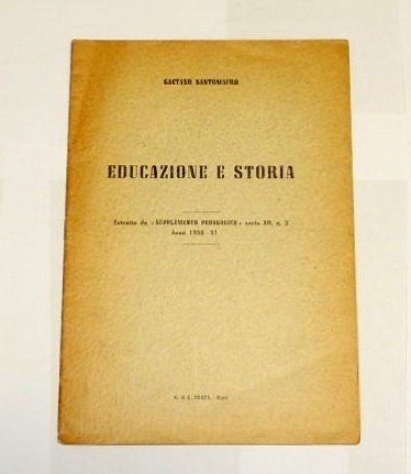 Gaetano Santomauro, Educazione e storia, G. e C. Resta, Bari s.d., pp. 14, cm 25. Estratto da Supplemento pedagogico, serie XII, n. 3, anno 1950-51. Minime tracce d'uso.
