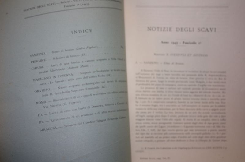 Codice 1601 Sanzeno - Pergine - Chiusi. Tratto da "Atti della Reale Accademia d'Italia. Anno 1943 Serie settima. Notizie degli Scavi di antichità. Volume IV - Fascicolo 1"., , , In 4° (cm 30), Brossura moderna in carta Varese, pagg.14 Stralcio da pag 3 a pag. 15 (la pag. 15 è in fotocopia) con 8 ill. b.n. n.t., ben conservato. Notizie relative alle scoperte archeolgiche presso: Sanzeno ("Elmo di bronzo"); Pergine ("Schinieri di bronzo"); Chiusi ("Resti di una tomba a camera scoperta a Villa Orienti in località Montebello")
