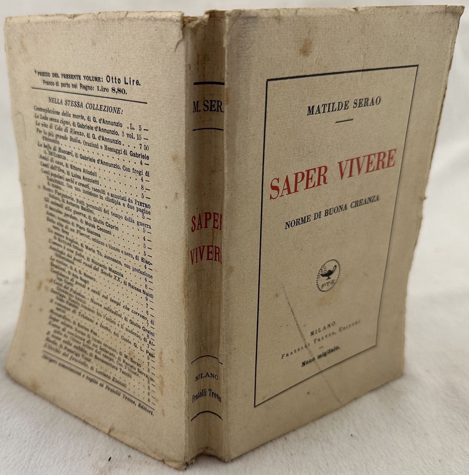 Edizione Treves del 1924, nono migliaio, di questo manuale del Galateo della scrittrice e giornalista Matilde Serao (1856-1927). Serao è stata la prima donna ad aver fondato e diretto un quotidiano. All'interno: Fidanzamento, richiesta di nozze, corredo, padrino di matrimonio, nozze civili, nozze religiose, nozze religiose, luncheon, viaggio di nozze, Partecipazioni, visite di nozze, L'unione mondana Lista mensa (invito a pranzo, grandi pranzi, Pranzo di mezza cerimonia), Festa da ballo, Piccolo intermezzo , I legami dello spirito i Sacramenti, Avvertenza (villeggiatura) Natale e Capo d'anno, L'educazione in Chiesa, La nota dolente (il lutto, come bisogna vestirsi, condoglianze visite, il lutto: uomini bimbipersone famigliari ec. In buone condizioni. Copertina editoriale in buone condizioni generali con lievi usure ai margini e dorso. Legatura in buone condizioni. All'interno le pagine si presentano in buone condizioni con rare fioriture. In 16. Dim. 17x11,5 cm. Pp. (8)+240+(6). Treves edition of 1924, 9th thousand of this manual of Good Manners by the writer and journalist Matilde Serao (1856-1927).<BR>Serao has been the first woman to establish a newspaper.<BR>Editorial original cover. In good conditions. Editorial cover in good general conditions lightly worn in the extremities. Binding in good conditions. Inside pages are in good conditions with occasional foxing. In 16. Dim. 17x11,5 cm. Pp. (8)+240+(6).