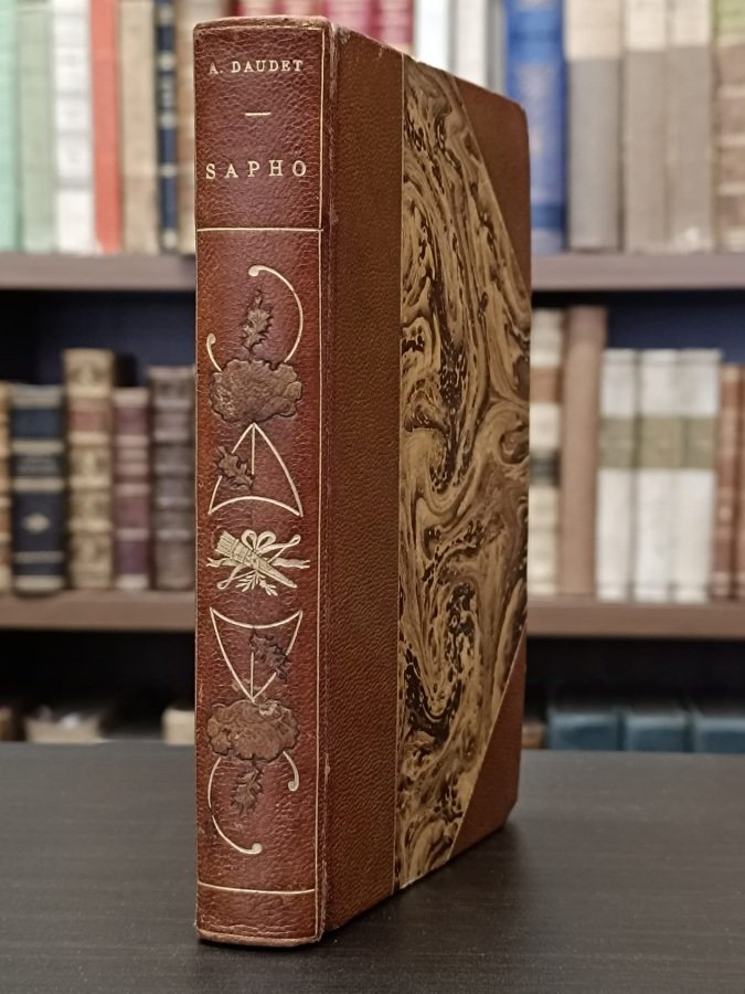 <span style="font-style: normal;">In-16° (cm. 18), bella legatura d'amatore in mezzo marocchino nocciola ad angoli, dorso liscio con titolo in oro, fregi in oro e intarsiati, inquadrati da un filetto sempre in oro (lievissime tracce d'uso), piatti e risguardi marmorizzati, taglio superiore dorato; conservata la brossura editoriale a stampa illustrata a colori; pp. 376 in stato molto buono (lieve brunitura uniforme). Piccola e graziosa edizione illustrata con numerose incisioni in nero nel testo realizzate da Rossi, Myrbach e altri artisti. </span><i>Collection Artistique Guillaume</i>. Cfr. Vicaire II, 703. Esemplare molto buono. (NG3)
