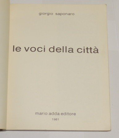 Giorgio Saponaro, Le voci della città, Mario Adda editore, Bari 1981, pp. 305, ill. b.n., cm 24, br. ed. con sovraccoperta. Il volume raccoglie le biografie in forma di intervista di 42 volti noti della società barese degli anni Settanta/Ottanta, tra i quali: Guido Spagnuolo, Raffaele Spizzico, Giovanna Laterza, Vito Carofiglio, Mario Montinari, Simone Di Cagno Abbrescia, Tina Trizio, Ferdinando Pinto, Michele Curci, Vincenzo Stifano, Pasquale Sorrenti, Tommaso Di Ciaula, Vittorio Stagnani, Mario Adda, Mino Colonna. Sovraccoperta con tracce d'uso, per il resto esemplare in buone condizioni.