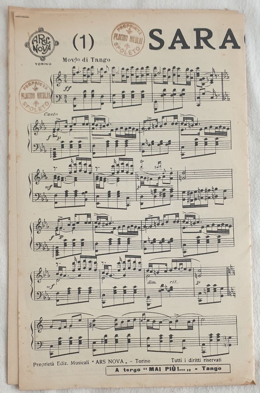 Partitura completa per orchestra del 1933 di due melodie "Saracena" di Leo Pant e "Mai più!." di Raffaele Valente Copertina assente. GENERE: Tango STRUMENTI: pianoforte; violini; viola, violoncello, flauto; tromba; trombone, batteria, contrabbasso, clarinetto, sassofono ANNO: 1933 DIMENSIONI: In 8. cm 27,5x17,5 PAGINE: pp. 28 CONDIZIONI: Buone condizioni. Copertina assente. Ex libris sulle pagine. Beautiful score of two songs of 1933, a complete score for orchestra of the melodies "Saracena" di Leo Pant e "Mai più!." di Raffaele Valente MUSIC: Tango STRUMENTI: piano; violins; viola, violoncello, flute, trumpet, trombone, drums, contrabbass, clarinet, saxophone YEAR: 1933 SIZE: In 8. cm 27,5x17,5. PAGES: pp. 28 CONDITIONS: Good conditions. Cover lacks<BR>NOTES: Ex libris in the pages