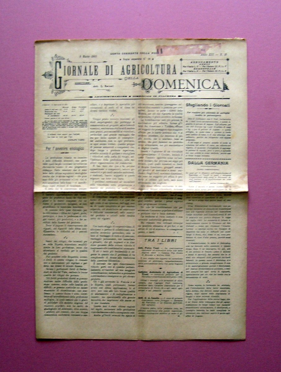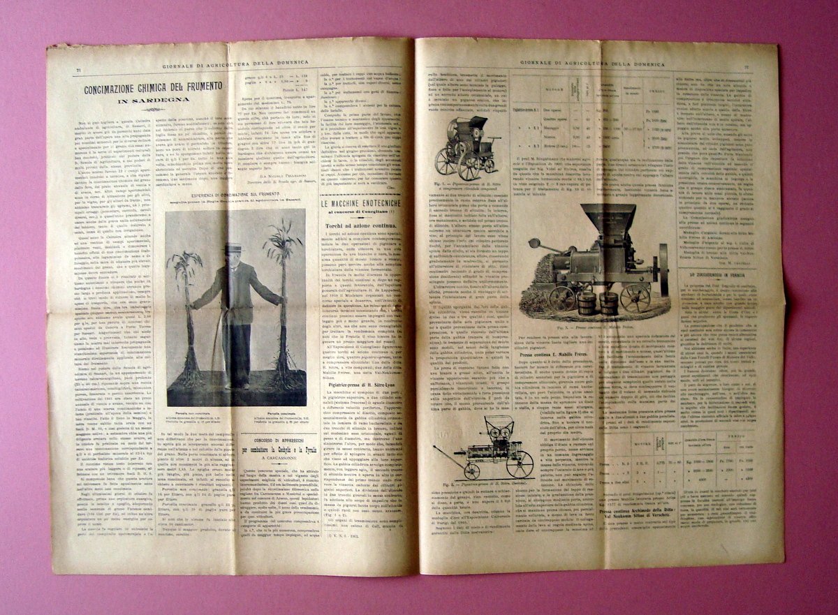 Periodico, Giornale di Agricoltura della Domenica" Concimazione Chimica del Frumento in Sardegna Anno XIII N 10 8 Marzo 1903 Piacenza, 1903; cm 44x31; pp.8 con numerazione progressiva annuale; ill. fot. b/n n.t. Numero completo. Condizioni di conservazione Esemplare in buone condizioni con tracce d'uso, pieghe di conservazione che si presenta leggermente ingiallite e con piccolissimi strappetti; margini con abrasioni e piccoli strappetti. Numero completo. Concimazione Chimica del Frumento in Sardegna 1 pagina con un'illustrazione fotografica SC03.D17737 blu "