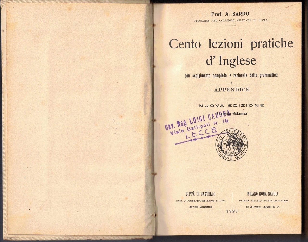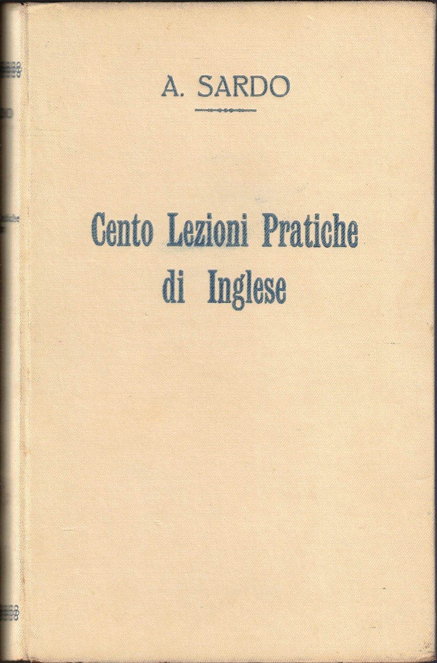 A. (Achille) Sardo, Cento lezioni pratiche d’inglese. Con svolgimento completo e razionale della grammatica e Appendice, Casa Tipografico-Editrice S. Lapi Società Anonima, Società Editrice Dante Alighieri di Albrighi, Segati e C., Città di castello, Milano, 1927, nuova ed., seconda rist., pp. XX, 506, cm 19, legatura in tutta tela con titoli e fregi al dorso e titoli al piatto. Timbro d’appartenenza al frontespizio. Minime abrasioni ai margini die piatti, minime fioriture ai tagli, leggera brunitura della carta, per il resto ben conservato.