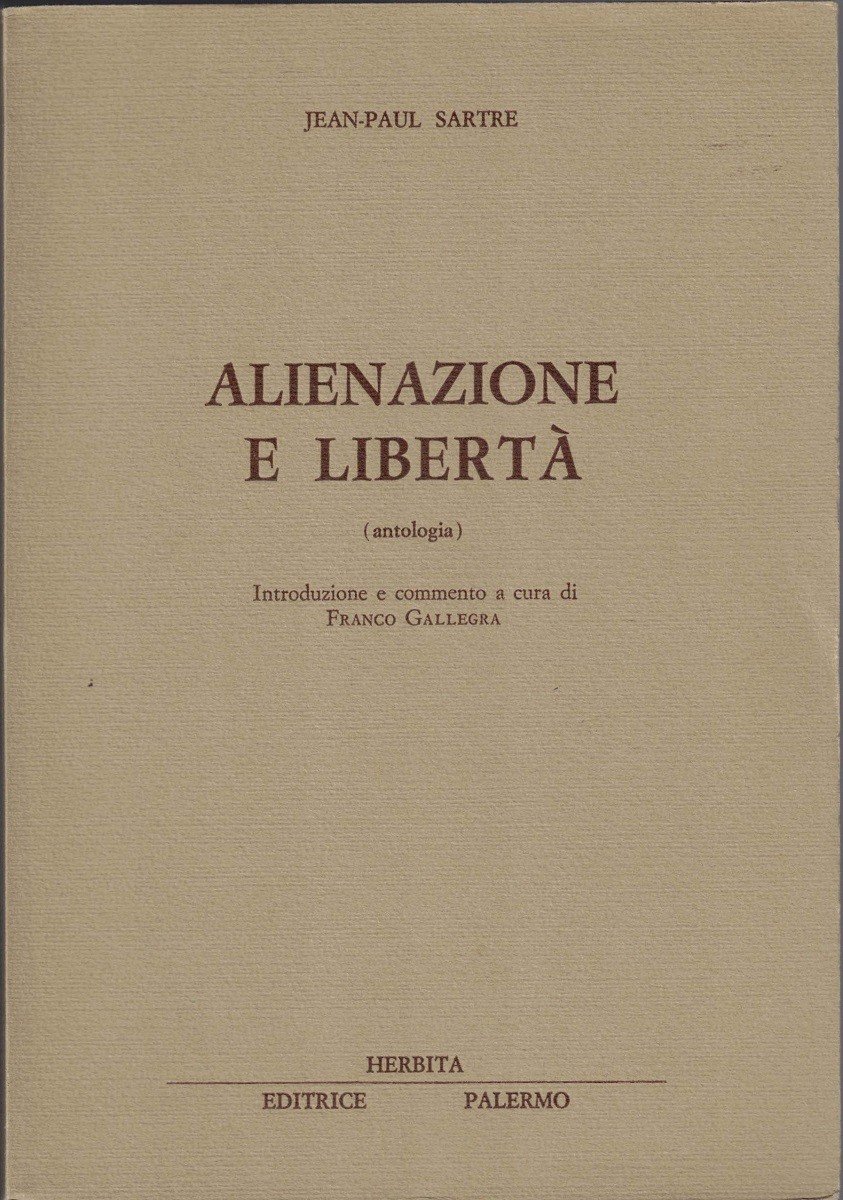 Jean-Paul Sartre, Alienazione e libertà. Antologia, introduzione e commento a cura di Franco Gallegra, Herbita Editrice, Palermo 1978, pp. 160, cm 22, br. ed. Copia di saggio priva dell’apposito talloncino all’angolo superiore del frontespizio. Piccola etichetta adesiva di libreria a margine della carta di guardia anteriore. Lievissima brunitura della carta, per il resto perfetto.