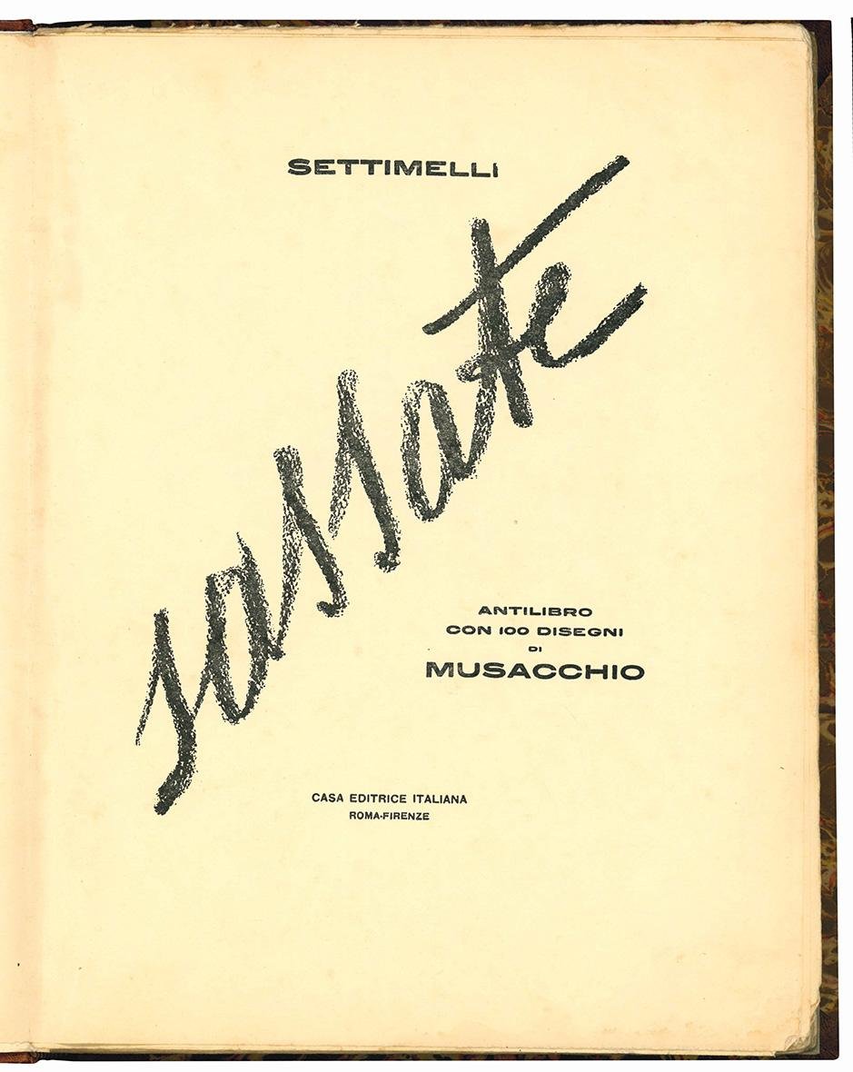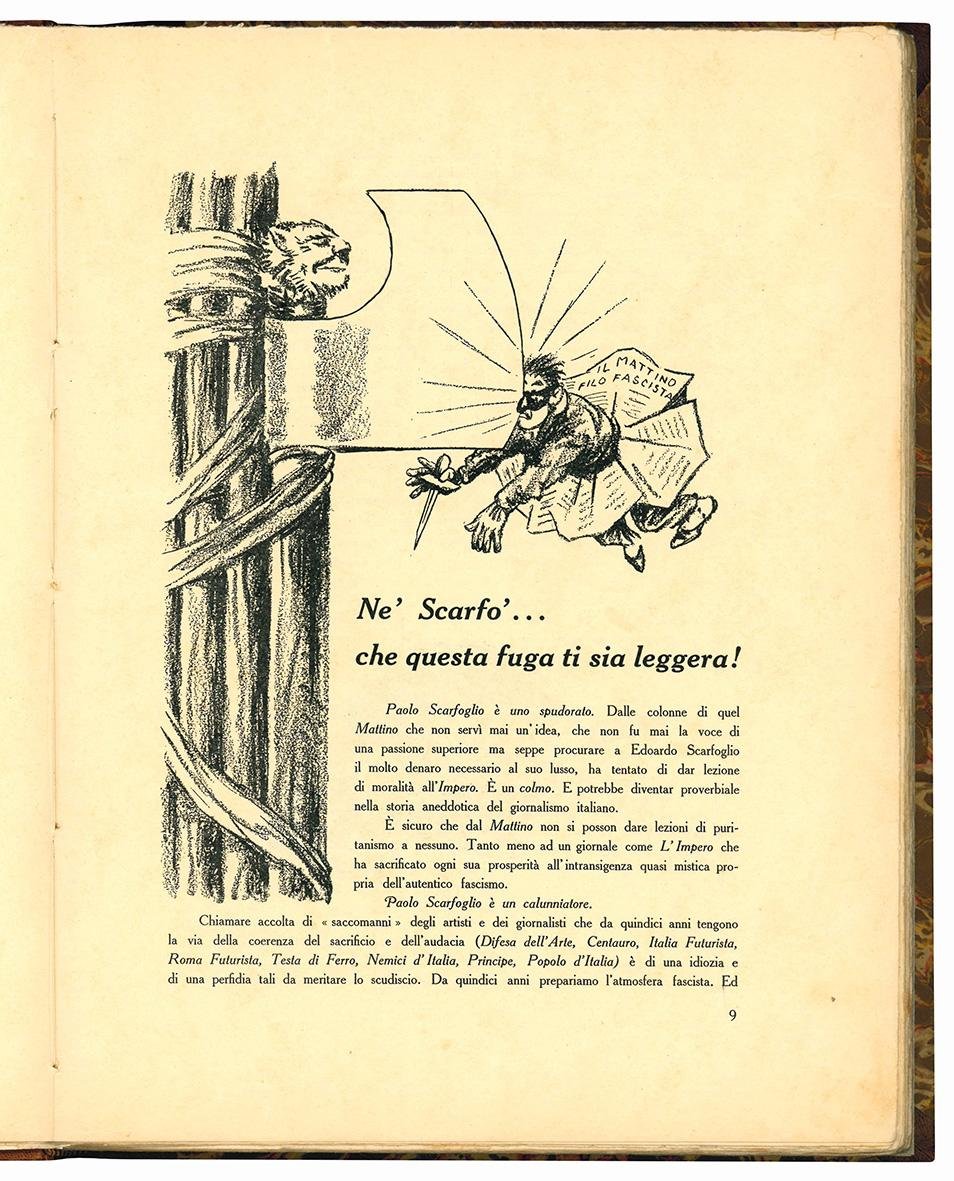 Prima edizione di questa raccolta di violente invettive, rivolte tra gli altri a Papini, B. Croce, Salvemini, Sem Benelli e Don Sturzo, accompagnate dai disegni di Musacchio.