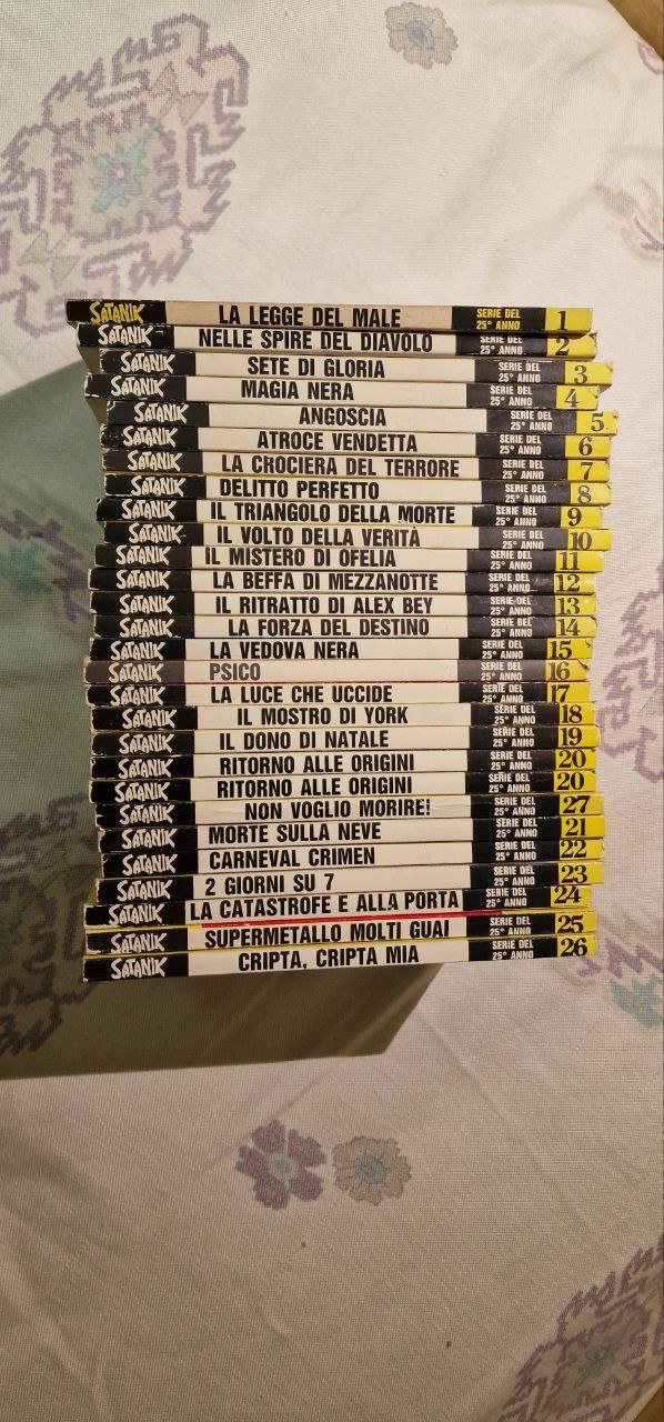 serie completa 1/27 disegni magnuselenco numeri : 1 Collana Psycho - Satanik # 1La legge del male Dec 19892 Collana Psycho - Satanik # 2Nelle spire del diavolo Feb 19903 Collana Psycho - Satanik # 3Sete di gloria Mar 19904 Collana Psycho - Satanik # 4Magia nera Apr 19905 Collana Psycho - Satanik # 5Angoscia May 19906 Collana Psycho - Satanik # 6Atroce vendetta Jun 19907 Collana Psycho - Satanik # 7La crociera del terrore Jul 19908 Collana Psycho - Satanik # 8Delitto perfetto Aug 19909 Collana Psycho - Satanik # 9Il triangolo della morte Sep 199010 Collana Psycho - Satanik # 10Il volto della verit? Oct 199011 Collana Psycho - Satanik # 11Il mistero di Ofelia Nov 199012 Collana Psycho - Satanik # 12La beffa di mezzanotte Dec 199013 Collana Psycho - Satanik # 13Il ritratto di Alex Bey Jan 199114 Collana Psycho - Satanik # 14La forza del destino Feb 199115 Collana Psycho - Satanik # 15La vedova nera Mar 199116 Collana Psycho - Satanik # 16Psico Apr 199117 Collana Psycho - Satanik # 17La luce che uccide May 199118 Collana Psycho - Satanik # 18Il mostro di York Jun 199119 Collana Psycho - Satanik # 19Il dono di Natale Jul 199120 Collana Psycho - Satanik # 20Ritorno alle origini Aug 199121 Collana Psycho - Satanik # 21Morte sulla neve Sep 199122 Collana Psycho - Satanik # 22Carneval Crimen Oct 199123 Collana Psycho - Satanik # 232 giorni su 7 Nov 199124 Collana Psycho - Satanik # 24La catastrofe ? alla porta Dec 199125 Collana Psycho - Satanik # 25Super metallo molti guai Jan 199226 Collana Psycho - Satanik # 26Cripta mia. cripta mia. Feb 199227 Collana Psycho - Satanik # 27Non voglio morireGli albi son fondi di magazzino, possono presentare qualche segno dovuto a conservazione ma non sono mai stati letti quindi come nuovi Possibilit? di acquistarli su richiesta singolarmente Per qualsiasi chiarimento non esitate a contattare 3473868184