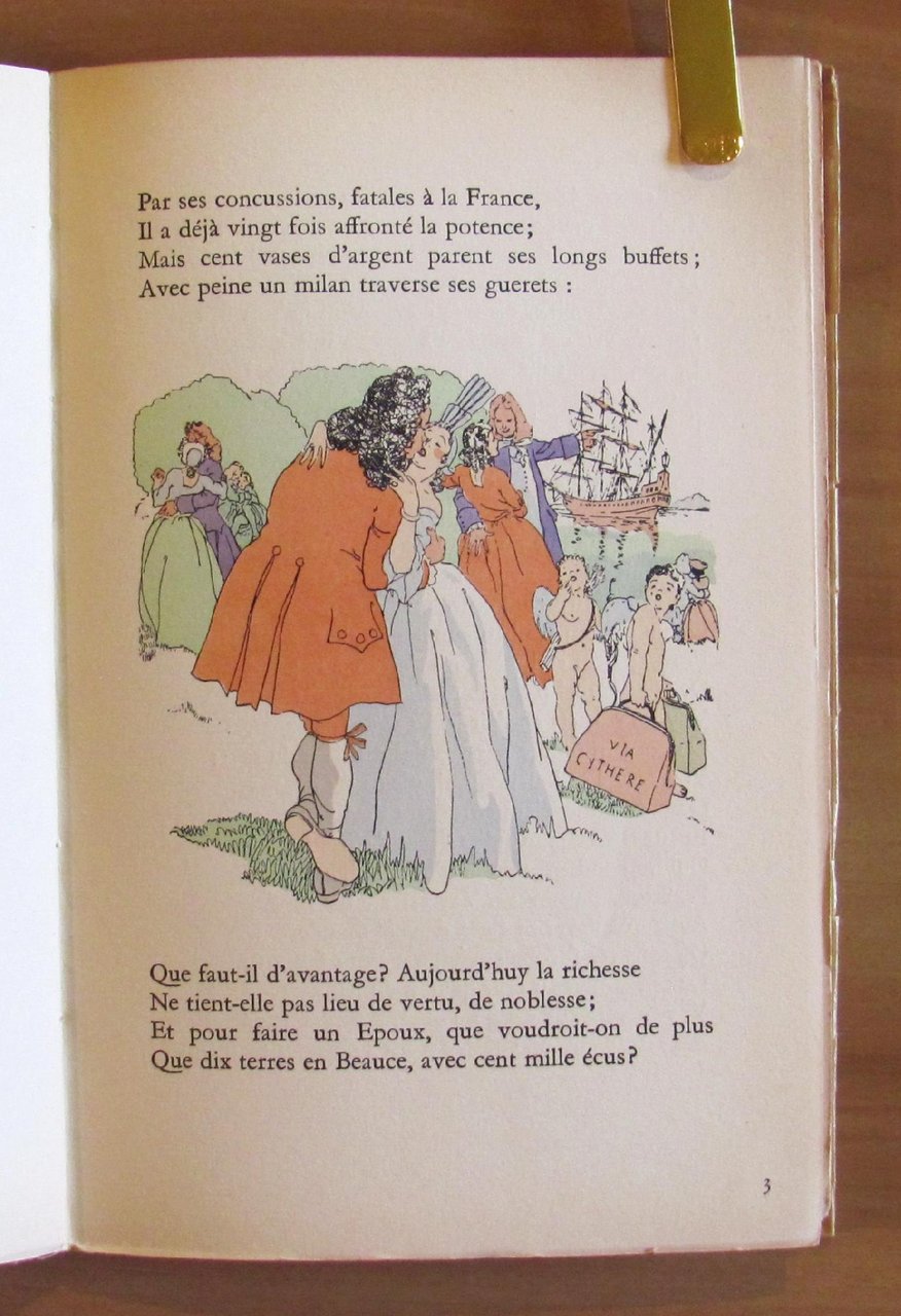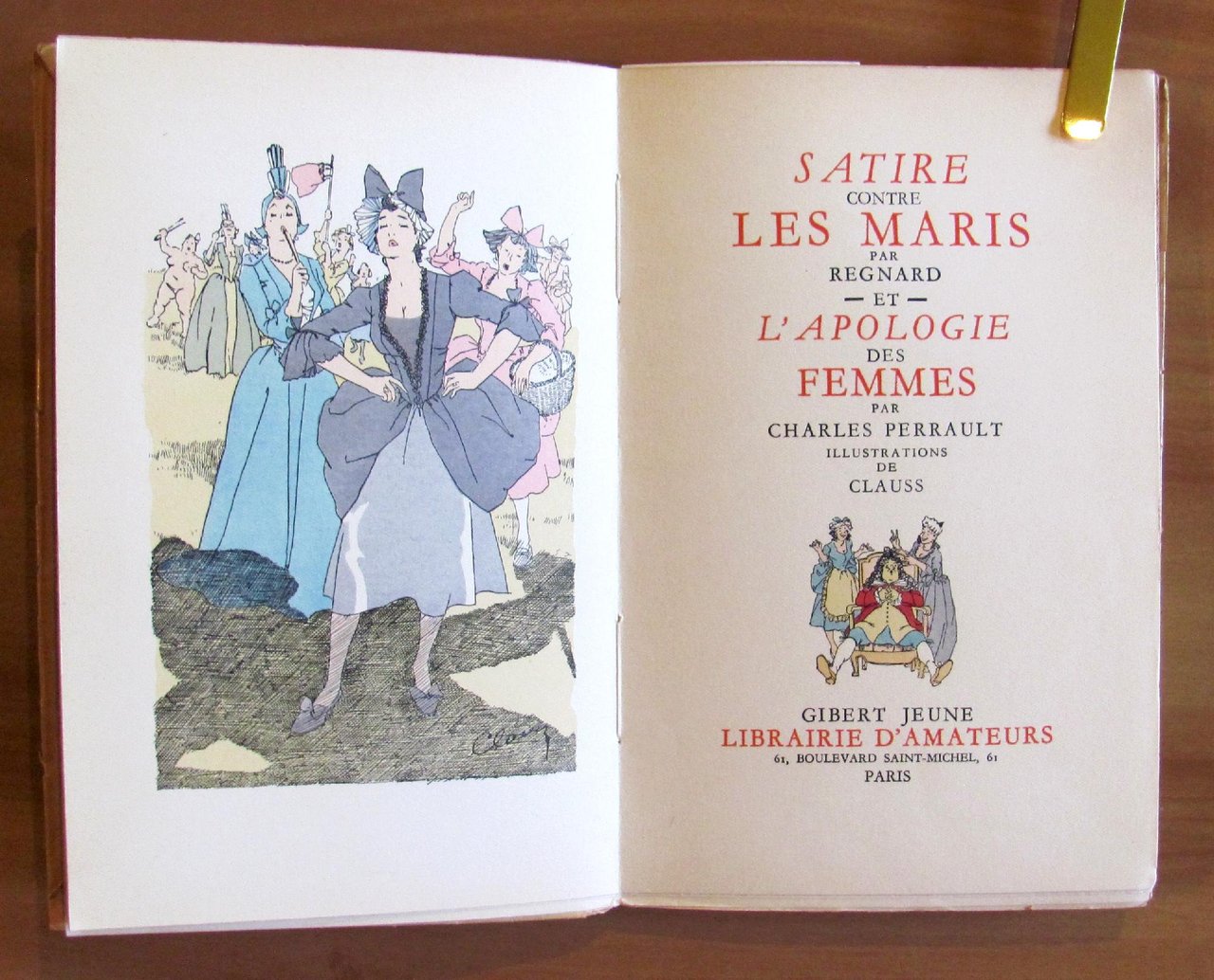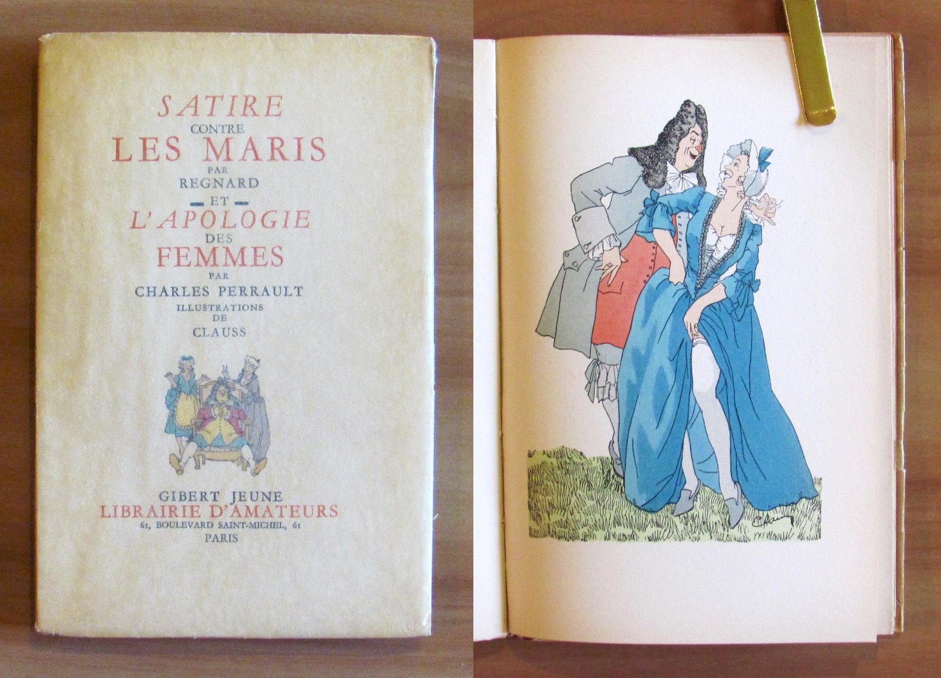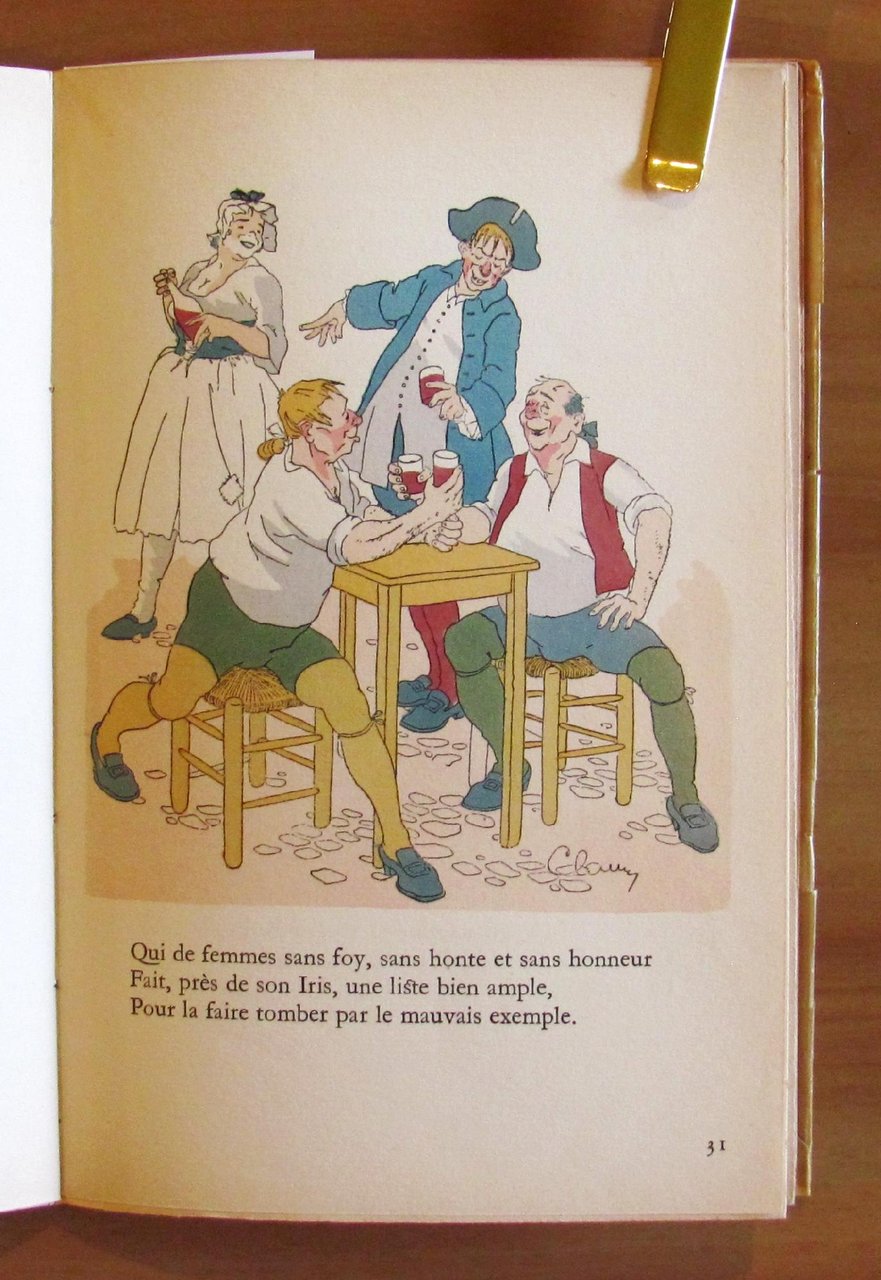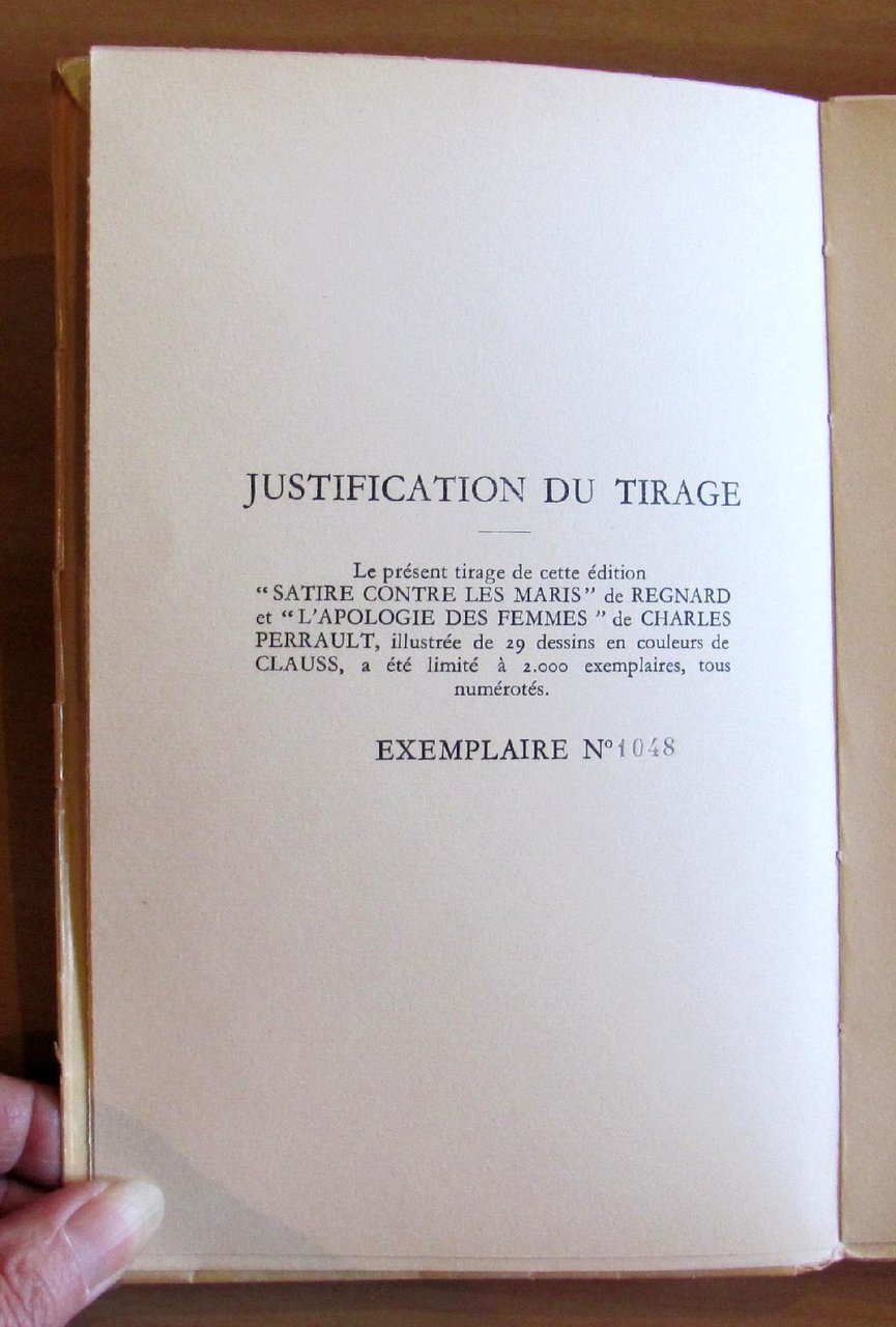 29 illustrazioni anche a piena e doppia pagina di Clauss colorate a pochoir da Paul e Jean Monnier. Librairie D'Amateurs Gibert Jeune - Paris, 1951. Tiratura Limitata a 2000 esemplari numerati, nostro N.1048. Brossura editoriale muta con sovraccoperta illustrata con titoli e ulteriore sovracopertina acetata. 13,5x20,5; pp.43. Stato di Nuovo. , Ottimo (Fine)