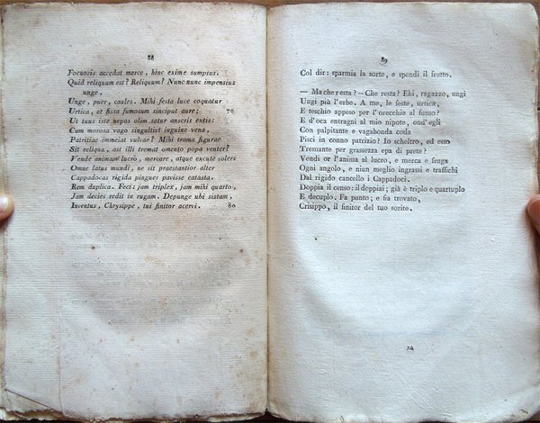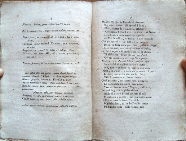 In-8° (21,3 x 13,6 cm), pp. 135, (1), copertina coeva muta con dorso rifatto. Tracce d'uso e del tempo alla copertina, in particolare, qualche piccola mancanza e, alla copertina anteriore, una piega longitudinale. Al frontespizio, nel bordo inferiore, lontano dalla parte impressa, due piccole mancanze. Piccolissime macchie di inchiostro che non intaccano il testo negli angoli superiori delle pagine 34-35. A pagina 39, al primo e al secondo rigo, l'ultima parola, che, causa errore in sede tipografica, non era stata stampata per intero, è stata completata da mano coeva, con piccole lettere tracciate, ad inchiostro, in elegante grafia: al primo rigo è stata reintegrata la lettera "i" della parola "Numi", al secondo sono state reintegrate le lettere "ensa" della parola "mensa". All'altezza di detto intervento, nel margine bianco esterno della pagina, la stessa mano ha segnalato i reintegri con un segno a inchiostro. Alcuni fascicoli leggermente arrossati, qualche segno d'umido, per il resto buon esemplare. L'opera è dedicata a Francesco Melzi d'Eril, vice presidente della Repubblica Italiana. Stampato su carta forte. Edizione contemporanea all'edizione originale (cfr. Gamba, 2646), stampata dalla stessa tipografia, ma in 118 pagine.