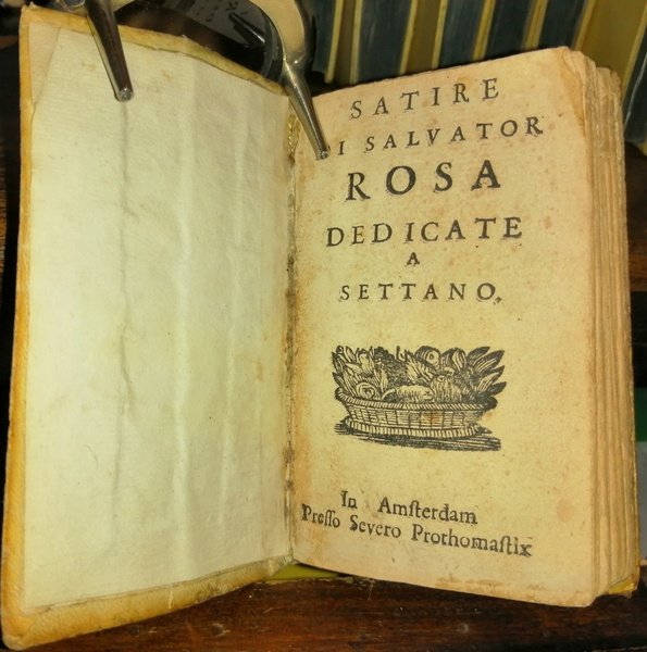 In-12 (11 cm) 160 (2) Cesto di frutta xilografato sul frontespizio e come finalino. Piena pergamena floscia coeva. Per il vero luogo di stampa e la data presunta, cfr. Autori italiani del 600, III, 146 (n. 2991): secondo il Brunet IV, 1390 l'opera sarebbe stata stampata nel 1664, ma, secondo il Cesareo, verso il 1695. Rosa Salvatore (1615-1673): Pittore, poeta, musicista, patriota. Nato a Napoli, morto a Napoli. Omesse nella paginazione le p. 87-88. Un foretto al margine laterale bianco di una trentina di pagine.