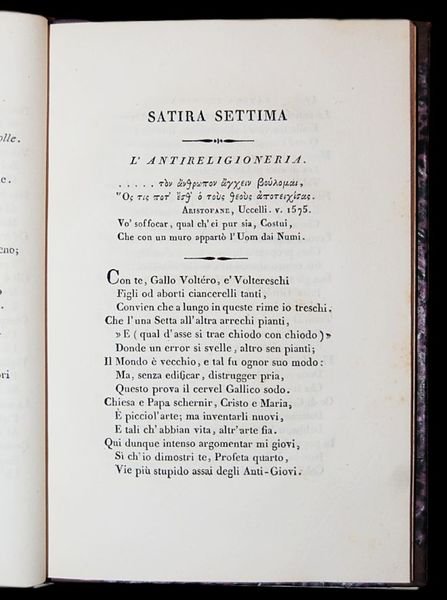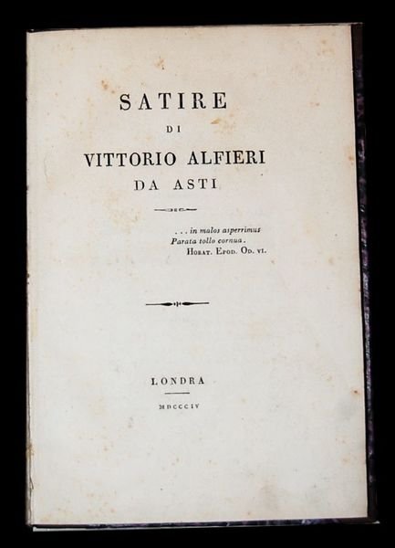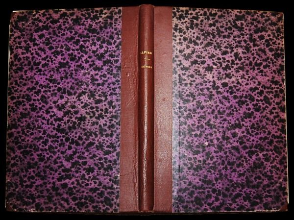 In 8° (20,6x14 cm); 108, (4) pp. Legatura anni 30' del ventesimo secolo in mezza tela marrone, con titolo impresso in oro al dorso e piatti marmorizzati. Qualche piccolissima ed ininfluente macchiolina i foxing al frontespizio e per il resto esemplare in perfette condizioni di conservazione dalla carta fresca e frusciante, margini assai ampi. Prima edizione, apparsa nelle "Opere Postume" delle celebri satire alfieriane.