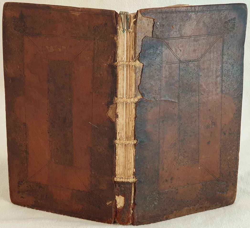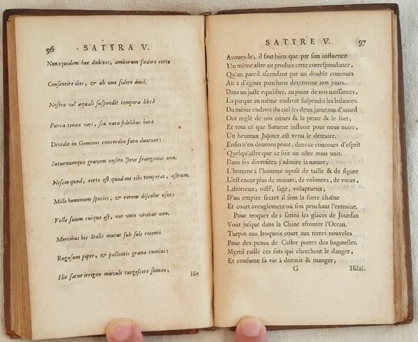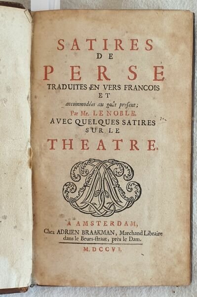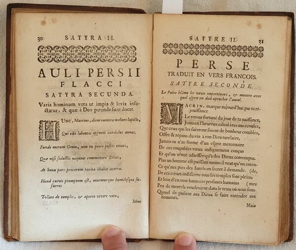 Edizione del 1706 di questa traduzione francese delle satire di Aulo Persio Flacco poeta satirico romano. Testo latino con a fronte traduzione francese a cura di Le Noble. Alla fine del volume satira sul teatro di anonimo. In buone condizioni e completo. Copertina in piena pelle coeva con decorazioni a secco ai piatti in mediocri condizioni generali con usure e parti mancanti ai margini e dorso. Piatti in parte staccati. Rotture alle cerniere. Legatura in buone condizioni con qualche lieve rottura. Pagine in buone condizioni con fioriture e gore d'umidità. In 16. cm. 17,5x10,5. Pp. (12)+15 Peso gr. 0,150Edition of 1706 of this french translation of satyres by Aulo Persio Flacco roman satyrical poet. Latin text with french translation by Le Noble. At the end of the volume satyre about theatre by anonimous. In good conditions and complete. Leather coeval cover with embossed decorations in plates in poor conditions with wearings and missing parts in the edges and spine. Plates partially detached. Cracks in the hidges. Binding in good conditions with some slight crack. Pages in good conditions with foxings and water stains. In 16. cm. 17,5x10,5. Pp. (12)+151 Peso gr. 0,150<BR><BR>
