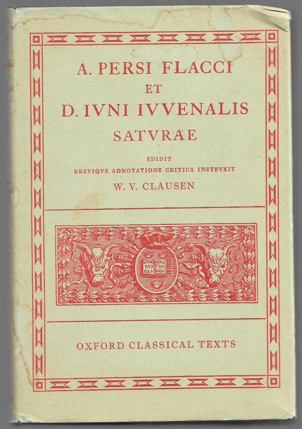 Libro vintage. Argomento: Saggi. Autore: Persi Flacci A. - Ivni Ivvenalis D. Editore: Oxonii a Typographeo Clarendoniano. Luogo: Oxford. Anno: 1966. Formato: in-16°. Pagg: 198. Legatura: Cartonata. Collana: Scriptorvm Classicorvm Bibliotheca Oxoniensis. Conservazione: Buona. Testo in latino. Prefazione di W. V. C. Angolo del prezzo tagliato. Ordinario segno del tempo.