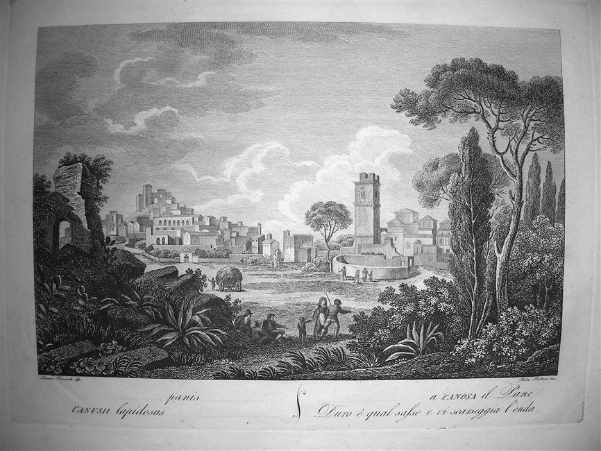in folio gr., pp. 16, leg. cartone rust. coevo. Con 18 belle tavv. in rame (mm. 230x310) raff. paesaggi: Ariccia (2), la via Appia, Foro Appio, Feronia, Subimus, Fondi, Formia, Sinuelsa, Capua, Cocceio, Benevento (2), Canosa, Bari, Brindisi, etc. Testo delle satire di Orazio in latino e volgare (di anonimo autore). [MM3-213]