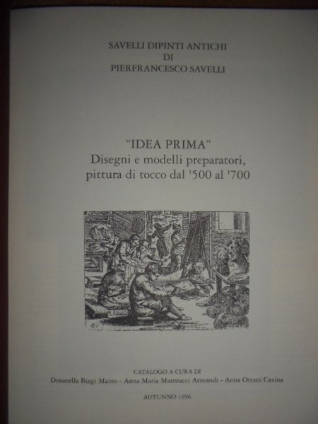 SAVELLI Dipinti Antichi di Pierfrancesco Savelli. "Idea Prima" Disegni e modelli preparatori, pittura di tocco dal '500 al '700. Catalogo a cura di Donatella Biagi Maino - Anna Maria Matteucci Armandi - Anna Ottani Cavina. Autunno 1996. In-8° grande, cartoncino edit. illustrato a colori con grandi alette. 149 pp. con numerose illustrazioni la maggior parte a colori n.t. Come nuovo. Neg. magazz. scat. 10