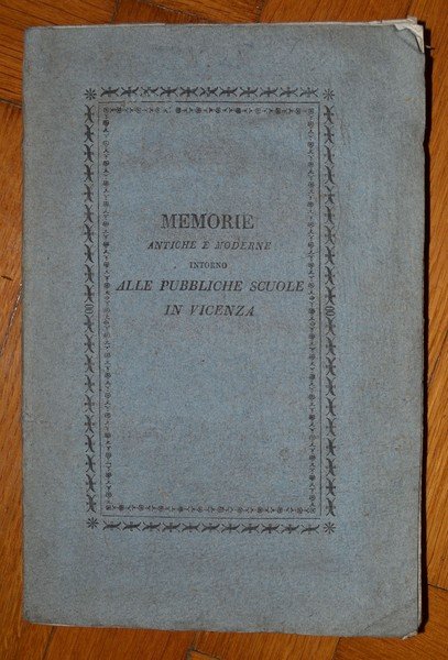 Note: In 8°, br. edit. (piccola gora al piatto post.), pp. 128,(4); minime tracce di tarlo nelle ultime 8 pp.che non intaccano minimamente il t.; sporadiche e rade fioriture sparse; alcuni fogli ancora chiusi; vol. dedicato al Conte Giulio Cesare Barbaran Podestà di Vicenza. Il testo tratta i seguenti argomenti: una breve storia di Vicenza, le scuole aperte da Carlo Magno in Italia, ruolo nel Clero nell'istruzione a partire dalla scuole aperte da S. Gregorio Magno VII nel 1078, l'Università Vicentina, l'istruzione pubblica a Vicenza, biografie dei Professori di Lettere a Vicenza dal XV al XVII secolo, stampa a Vicenza e dintorni; Accademie istituite a Vicenza, Seminario Vescovile, Pubblica Libreria e le scuole pubbliche dopo i Gesuiti con un appendice con i documenti a cui si fa riferimento nei vari capitoli; buonissimo es.