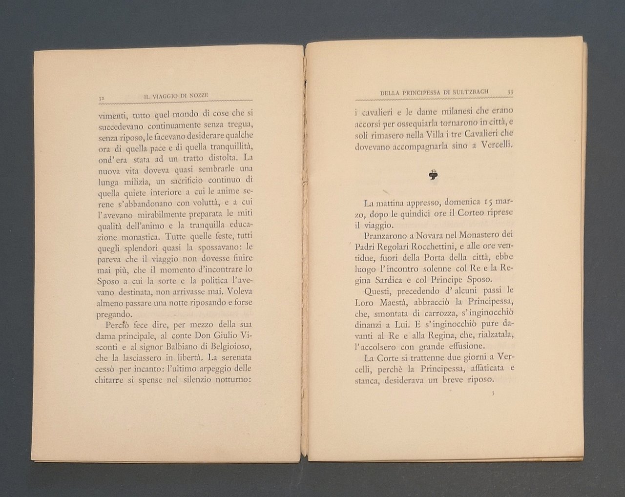 >in-16, pp. 64, broch. edit. con titoli in rosso e nero entro graziosa cornice al piatto ant. Edizione originale, non comune. Ricostruzione storica del viaggio che condusse a Vercelli, e poi a Torino, Anna Cristina Luisa di Sulzbach principessa del Palatinato-Sulzbach per sposare il futuro re di Sardegna Carlo Emanuele III di Savoia. L'opera si compone di una parte che narra il viaggio in gradevole prosa, e dei carteggi dell'epoca che ne documentano spostamenti e dettagli del suo viaggio. Ottimo esemplare.