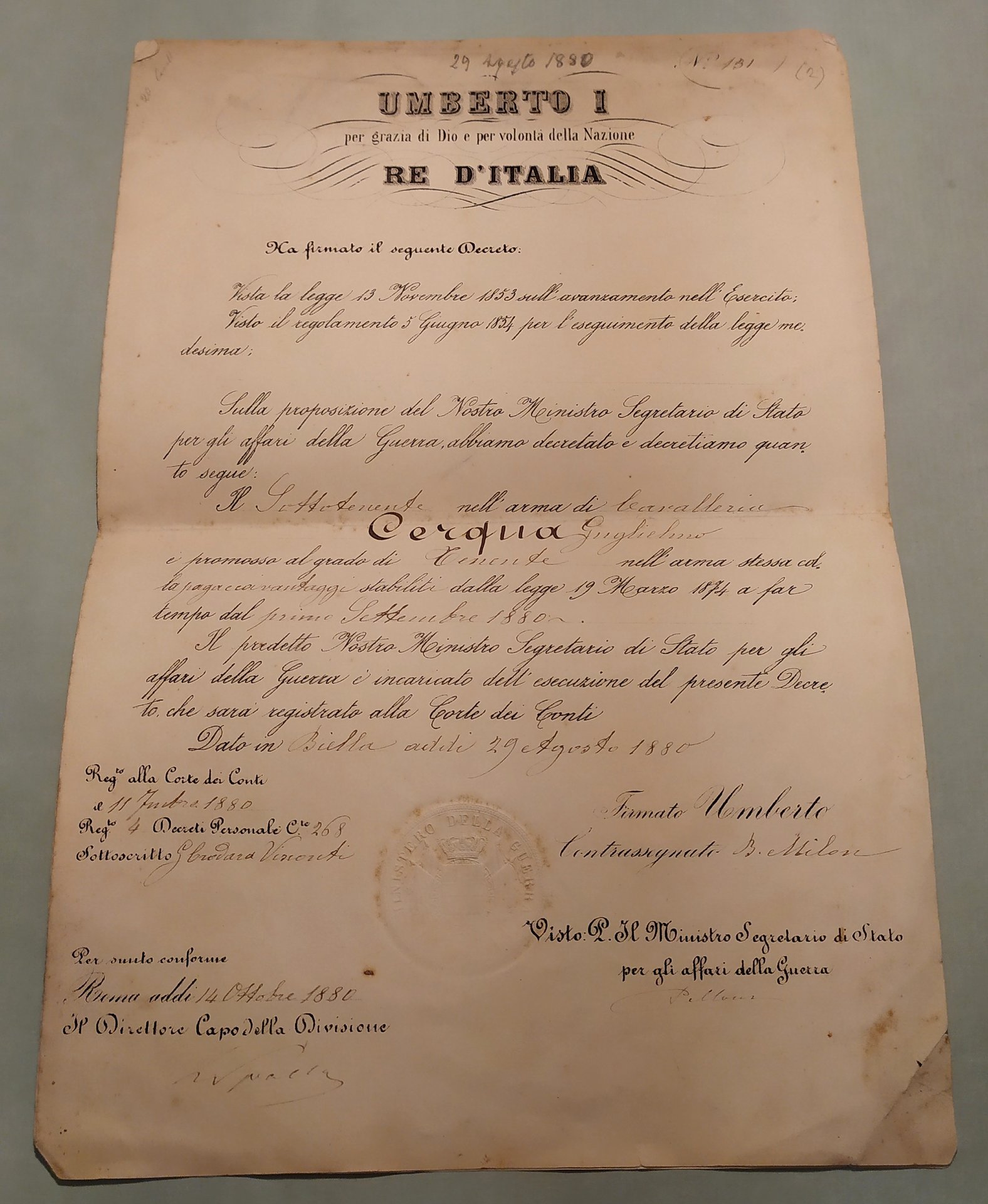 La carriera di un soldato sabaudo attraverso le promozioni dal grado di Sottotenente a quello di Maggiore Generale fino alla pensione. Sei decreti in 4to emanati a Biella, Torino e Roma da Vittorio Emanuele II, Umberto I e Vittorio Emanuele III dal 1877 al 1918.
