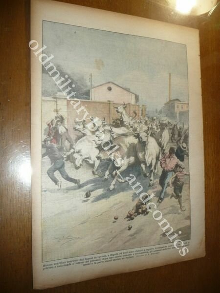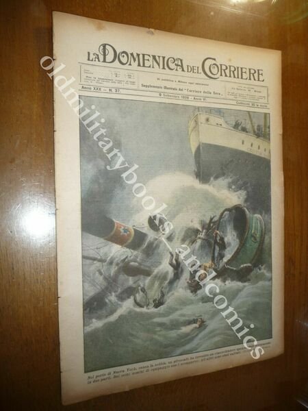 DESCRIZIONE: Domenica del Corriere, Anno XXX n. 37 (9 settembre 1928). COPERTINA: Nel porto di Nuova York un piroscafo investe un rimorchiatore. RETRO: Mentre vengono scaricati dai vagoni ferroviari, a Napoli, 24 buoi sono riusciti a fuggire seminando il panico nelle strade. La Domenica del Corriere è stato un popolare settimanale italiano fondato a Milano nel 1899 e chiuso nel 1989. Apparve per la prima volta nelle edicole l'8 gennaio 1899 come supplemento illustrato del Corriere della Sera. Stampata in grande formato (sul modello del domenicale La Tribuna illustrata), aveva 12 pagine e veniva distribuita gratis agli abbonati del Corriere, oppure si poteva acquistare in edicola per 10 centesimi. La prima e ultima di copertina erano sempre disegnate. Il Corriere si avvaleva di un giovane disegnatore, Achille Beltrame, allora sconosciuto, a cui veniva affidato in ogni numero il compito di rendere con la sua tavola il fatto più interessante della settimana. Dopo la sua morte nel 1945, fu sostituito da Walter Molino che, come il suo predecessore, firmò memorabili copertine. A differenza dei settimanali dell'epoca, la Domenica del Corriere diede ampio spazio alle fotografie e ai disegni, e questo fu uno dei motivi del suo successo. CONDIZIONI: Ottime, senza azzurrina, proveniente da rilegatura. PESO / WEIGHT: 100 gr. without package
