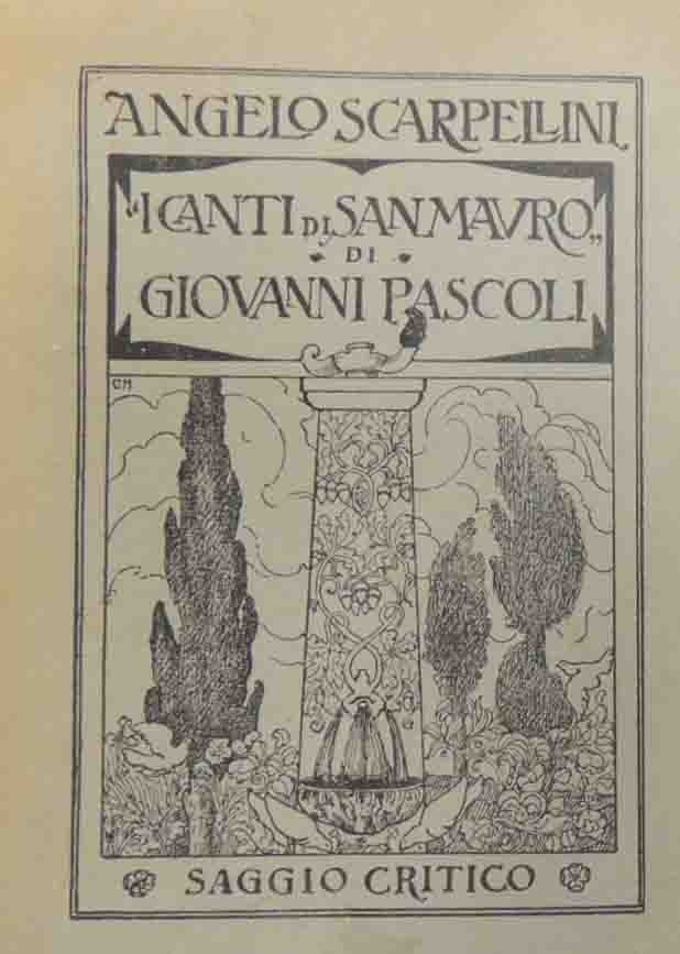 Angelo Scarpellini, I canti di San Mauro di Giovanni Pascoli. Saggio critico , con prefazione di G. M. Ferrari professore alla R. Università di Bologna e presidente del Comitato Nazionale per le onoranze a G. Pascoli, Stab. Tipografico Pietro Pascucci e C., Savignano di Romagna 1924, pp. 91, 6 c. di tavv. f.t. ill. b.n., cm 24, br. ed. Firma d’appartenenza alla prima pagina di guardia. Tracce d’uso, bruniture, piccoli restauri e minime mancanze al dorso, qualche sporadica sottolineatura a biro, per il resto ancora buona copia. Raro.