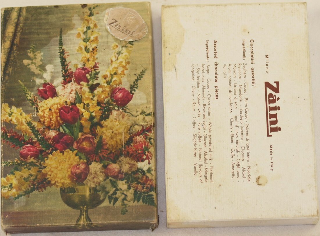 Bella scatola in cartone rigido degli anni '60 circa che conteneva cioccolati Zaini. Bella illustrazione di un mazzo di fiori. Etichetta Zaini. In buone condizioni. Dim. cm 20,5x13,5x3. Beautiful rigid case of Zaini chocolate showing the illustration of a flower. Original label of the firm. In good conditions.