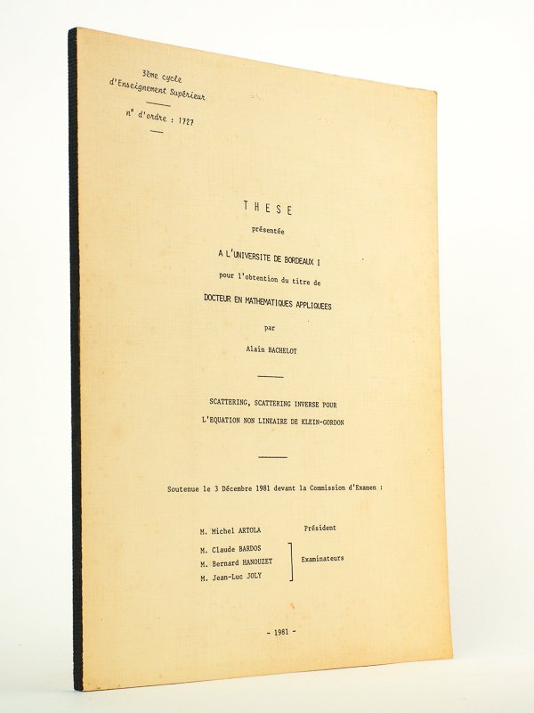 Scattering, Scattering inverse pour l'équation non-linéaire de Klein-Gordon ( Thèse présentée à l'Université de Bordeaux I, pour l'obtention du titre de Docteur en Mathématiques Appliquées , soutenue le 3 décembre 1981 ) [ Exemplaire dédicacé par l'auteur ]