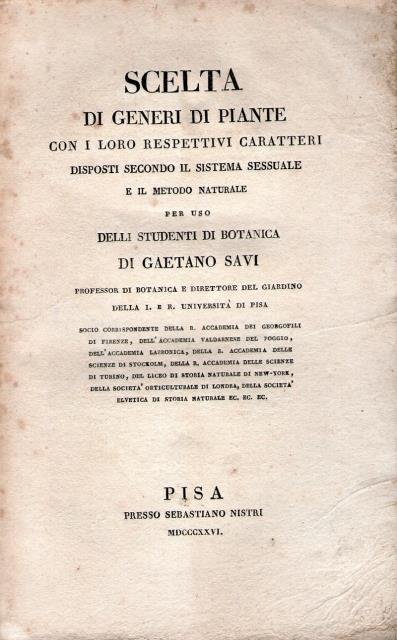 Scelta di generi di piante con i loro rispettivi caratteri disposti secondo il sistema sessuale e il metodo naturale. Per uso degli studenti di botanica di Gaetano Savi Professor di botanica e Direttore del giardino della I. e R. Università di Pisa.